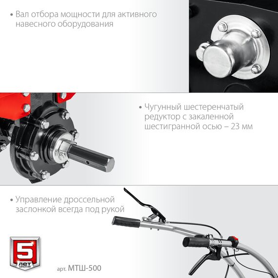 - 2 скорости вперед (понижающая, основная) и 1 назад позволяют комфортно работать на любых типах почвы