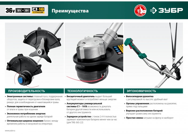Бесщеточный триммер Зубр ТАБ-365-22 36В, 2х18В АКБ (2Ач)
