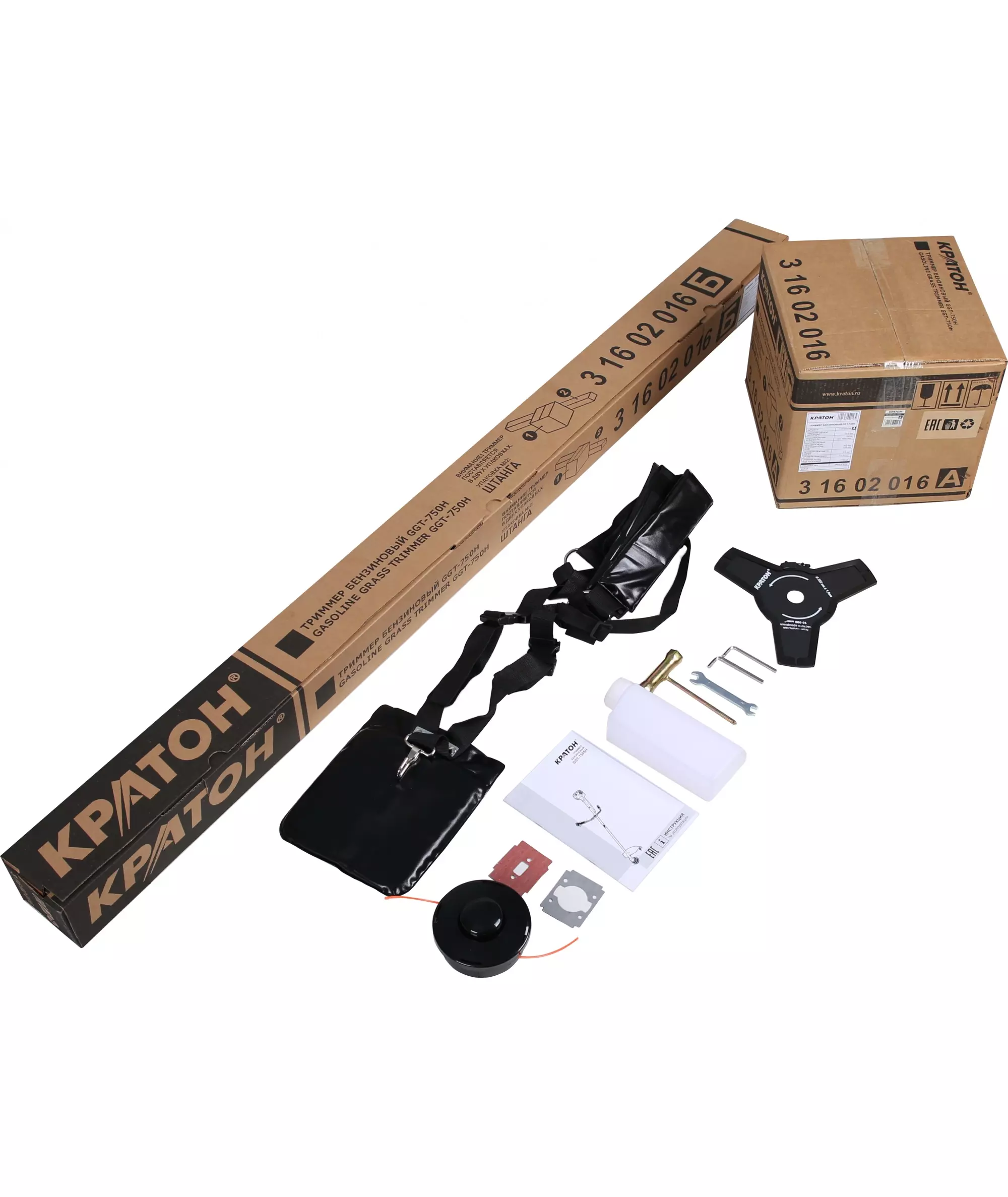 | Комплект поставки | Триммер, штанга, защитный кожух, рукоятка: 2 шт.; ремень одноплечный, режущая головка с кордом, режущий нож, емкость для топливной смеси, комплект крепежных изделий, прокладки, ключ универсальный, ключ рожковый, ключ шестигранный: 2 шт.; инструкция по эксплуатации, коробка картонная: 2 шт. |