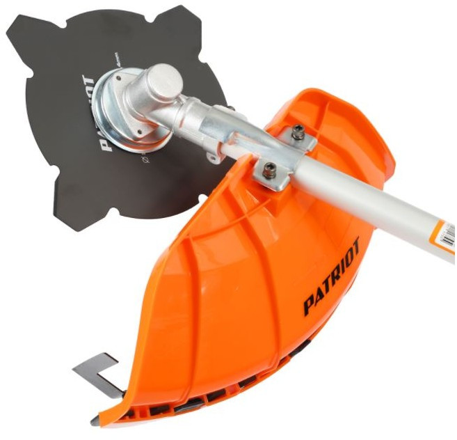 - Специальный 4х-лопастной нож бензинового триммера с неразборной штангой PATRIOT PT 3555ES Country предотвращает разлет ядовитого сока и частей борщевика и амброзии