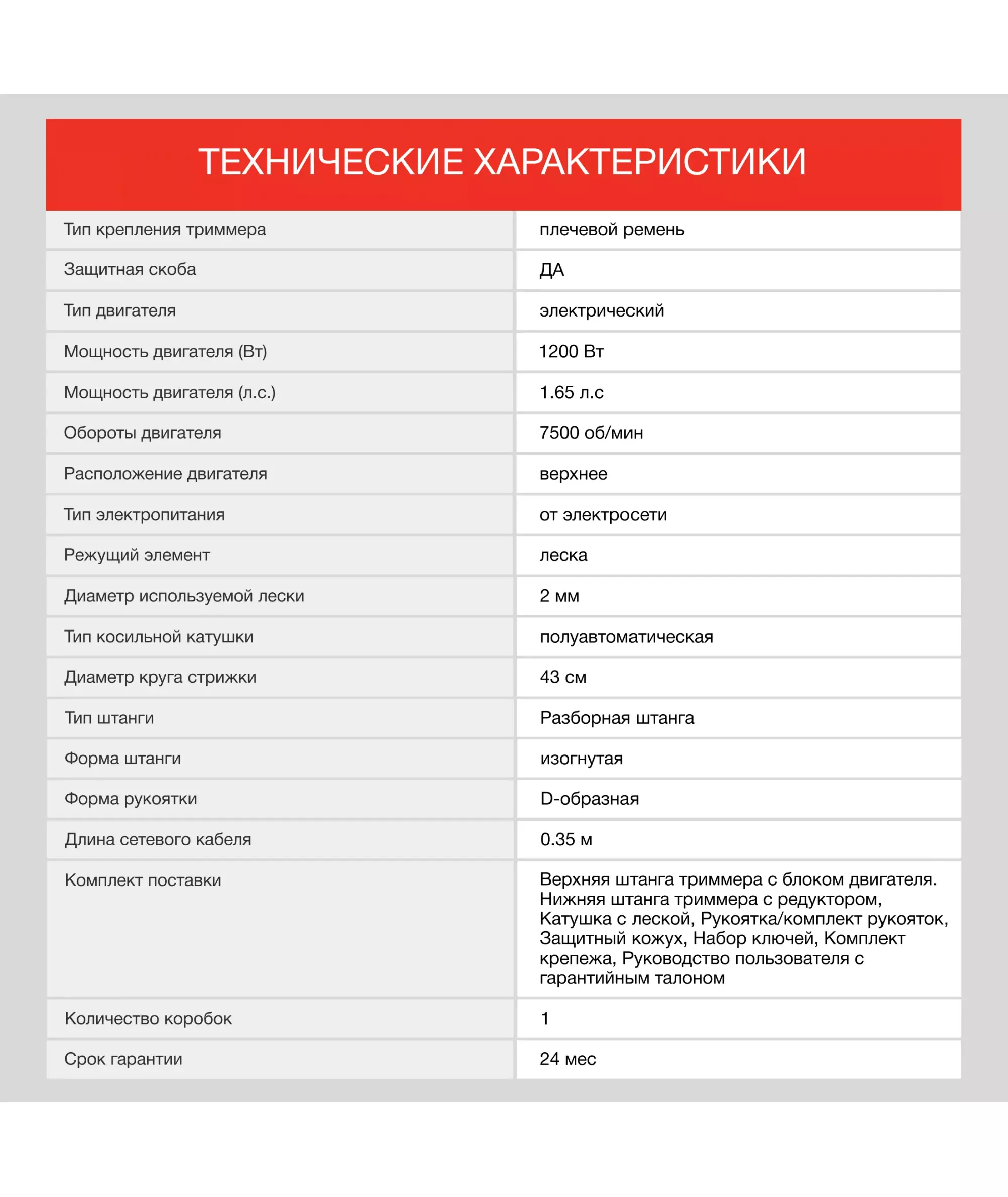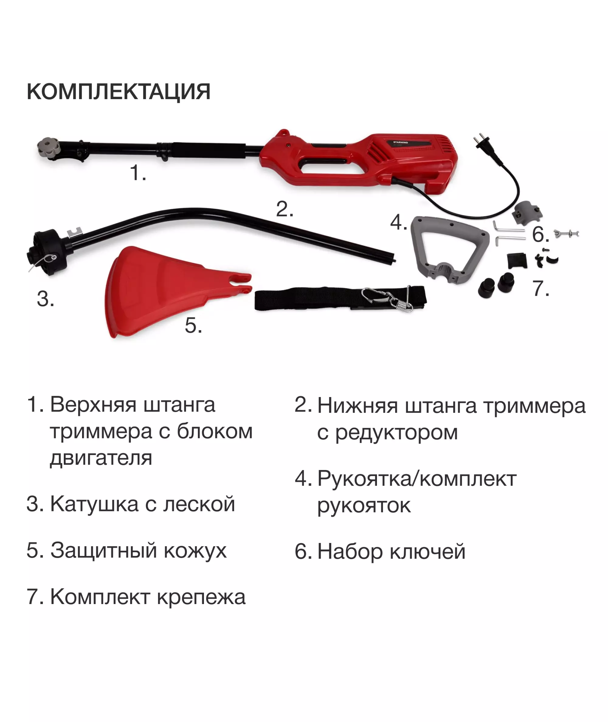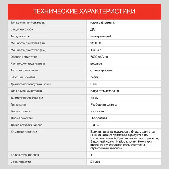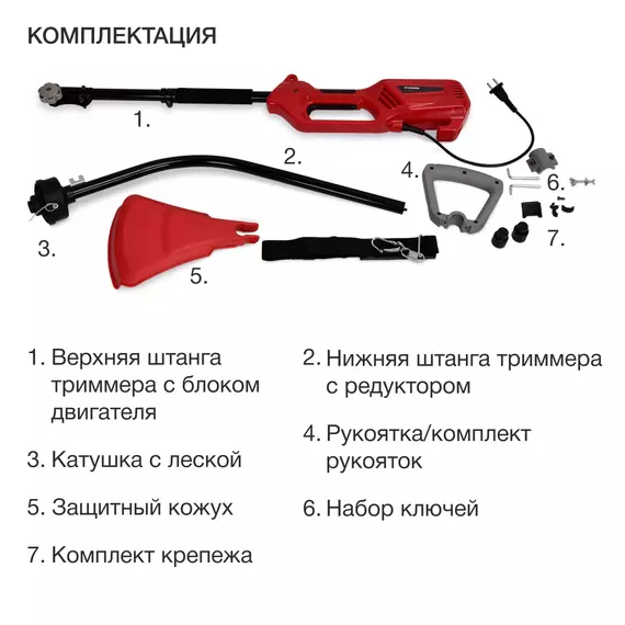 | Комплект поставки | Верхняя штанга триммера с блоком двигателя. Нижняя штанга триммера с редуктором, Катушка с леской, Рукоятка/комплект рукояток, Защитный кожух, Набор ключей, Комплект крепежа, Руководство пользователя с гарантийным талоном |