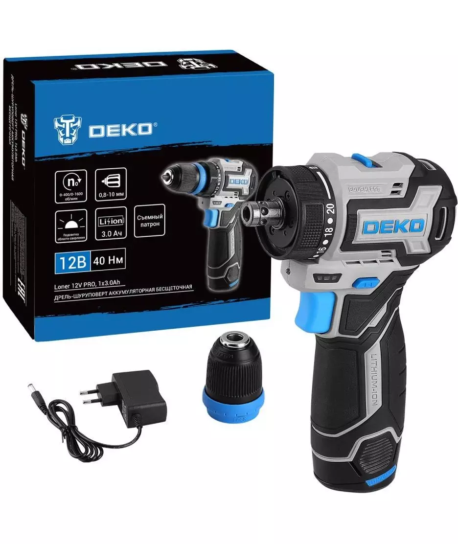 Дрель-шуруповерт аккумуляторный Deko Loner 12V Pro патрон быстрозажимной, кейс [085-1121]