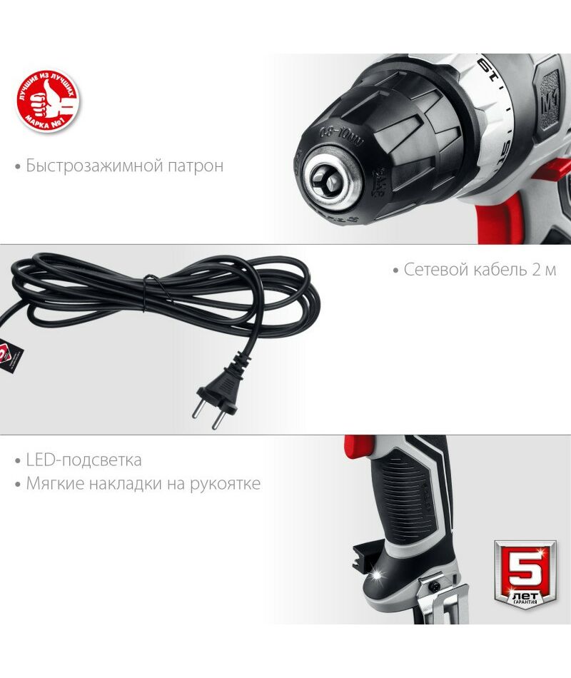 - Максимальная частота вращения 1800 об/мин помогает легко и быстро сверлить даже металлические заготовки