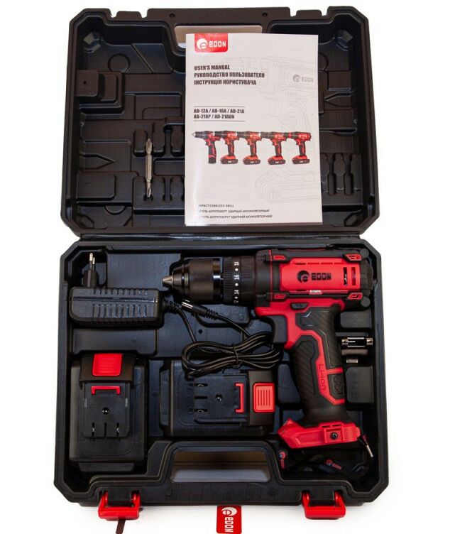 Дрель аккумуляторная ударная EDON AD-21AP Li-Ion 21В, 40Нм, 450/1450об/мин, 2х2Ач; 1,34кг; кейс [202020100013]
