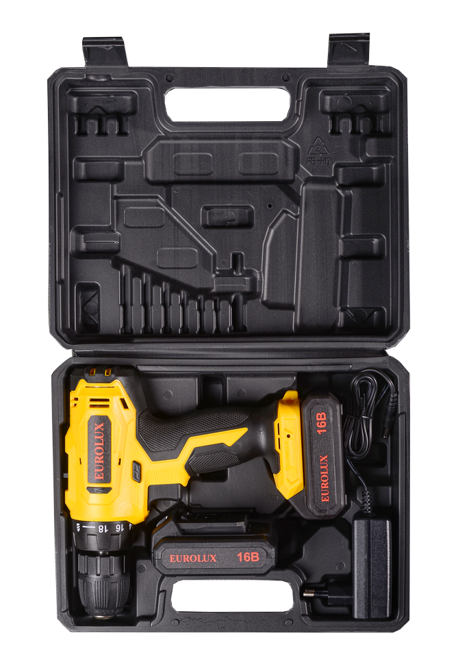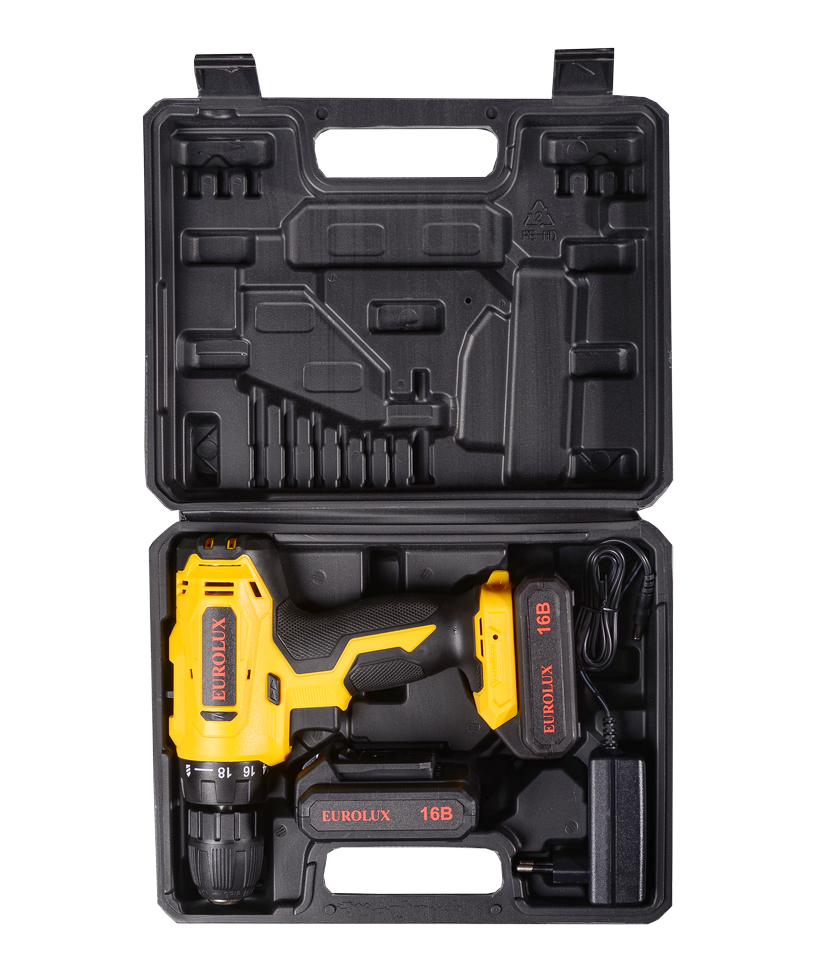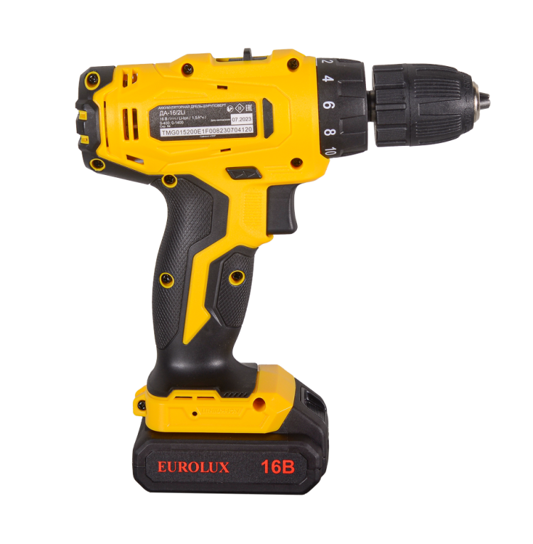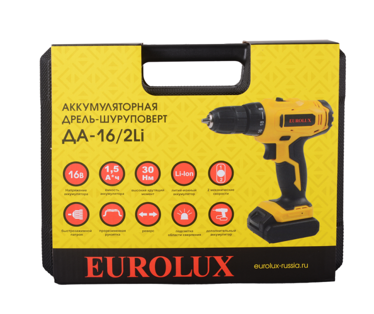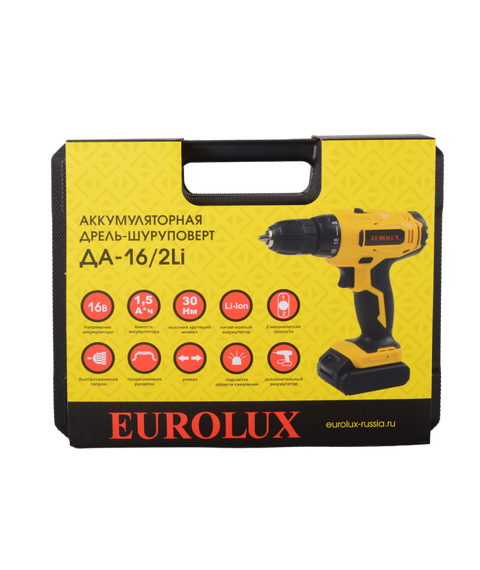Дрель-шуруповерт аккумуляторная Eurolux ДА-16/2Li безударная, быстрозажимной патрон, 0-400; 0-1400 об/мин, 30/15 Нм, 16В, 1.5 А*ч, 1.25 кг, кейс