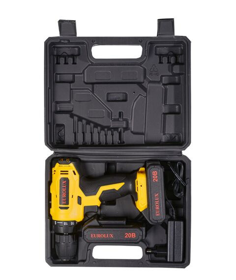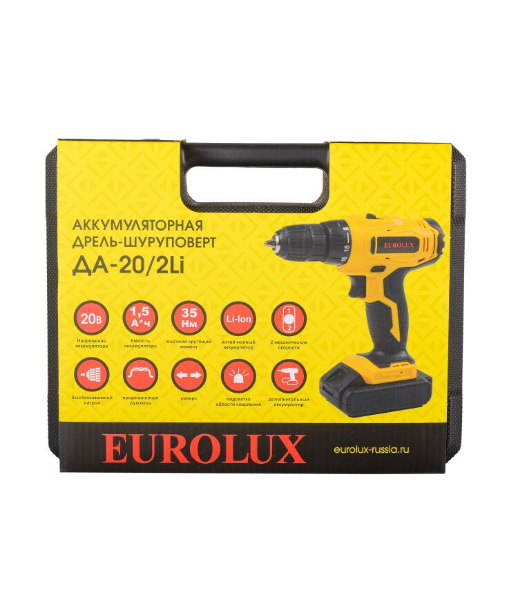 Дрель-шуруповерт аккумуляторная Eurolux ДА-20/2Li безударный, быстрозажимной, 0-400, 0-1400 об/мин, 35/18 Нм, 20В, 1.5 А*ч, 1.3 кг, кейс