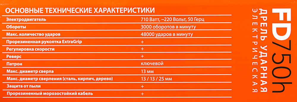 | Комплект поставки | Дрель ударная, дополнительная рукоятка, ограничитель глубины сверления, запасные щетки, инструкция по эксплуатации. |