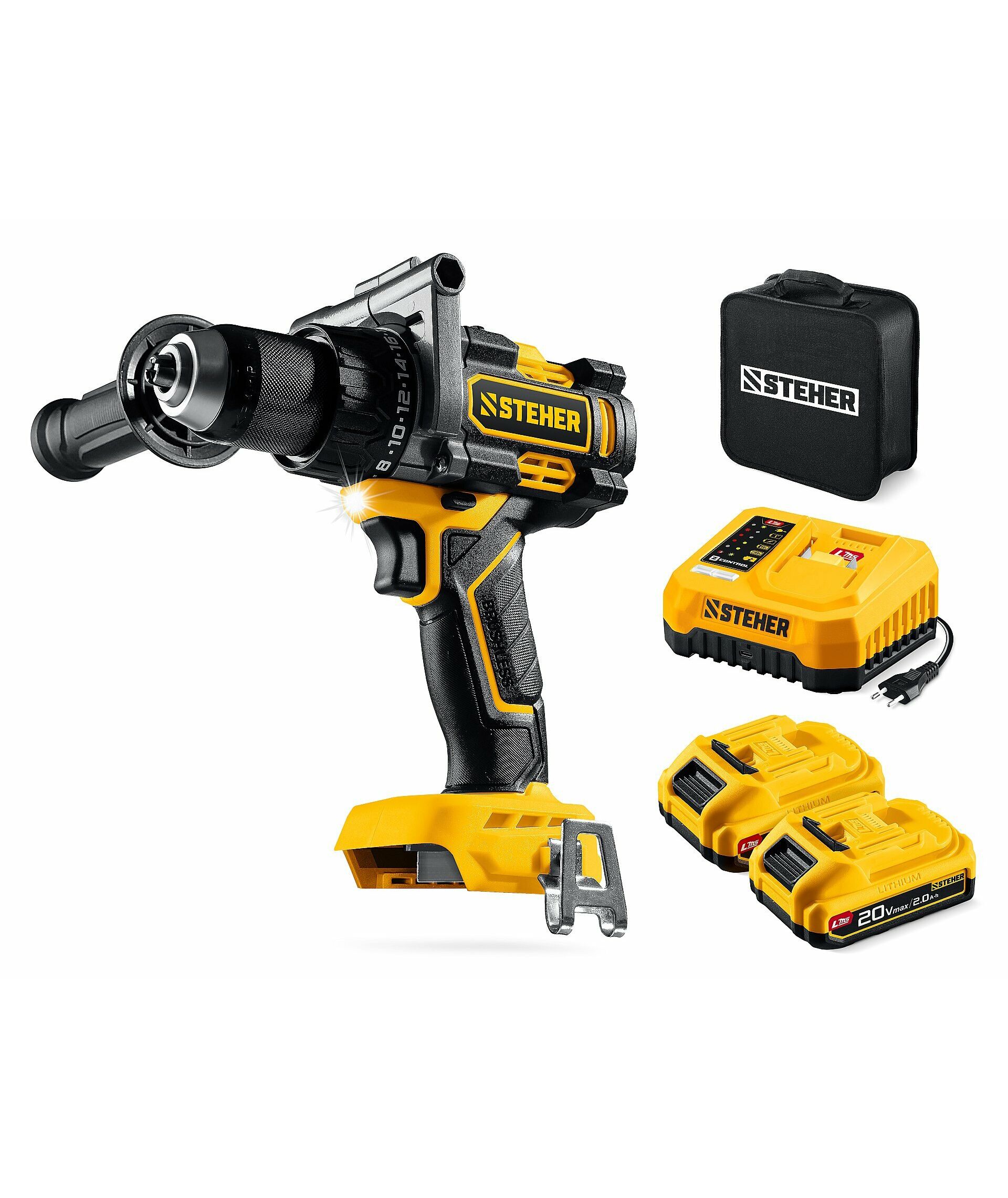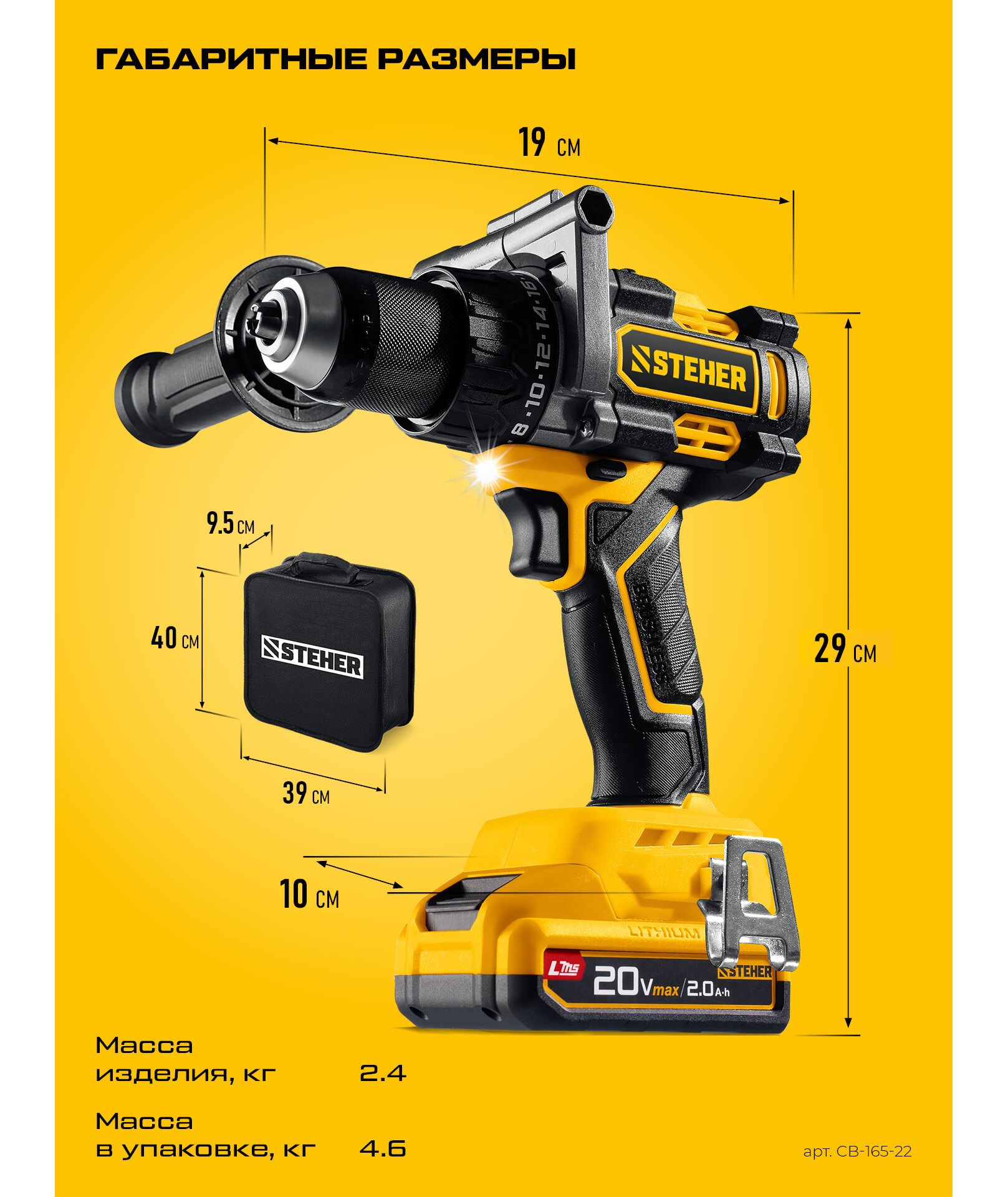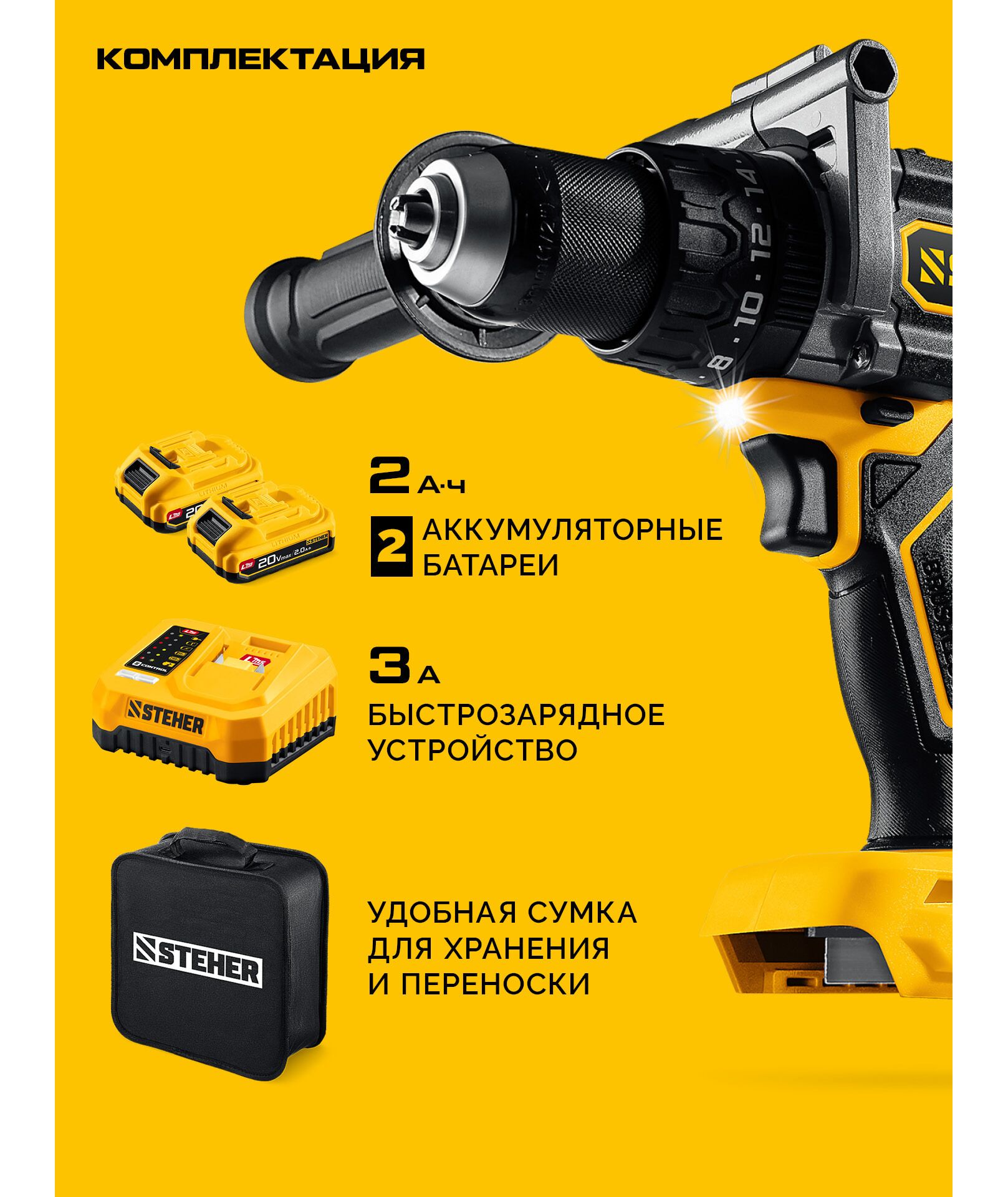 Бесщеточная дрель-шуруповерт STEHER CB-165-22 20 В, 165 Н·м, 2 АКБ LMS (2 А·ч), сумка