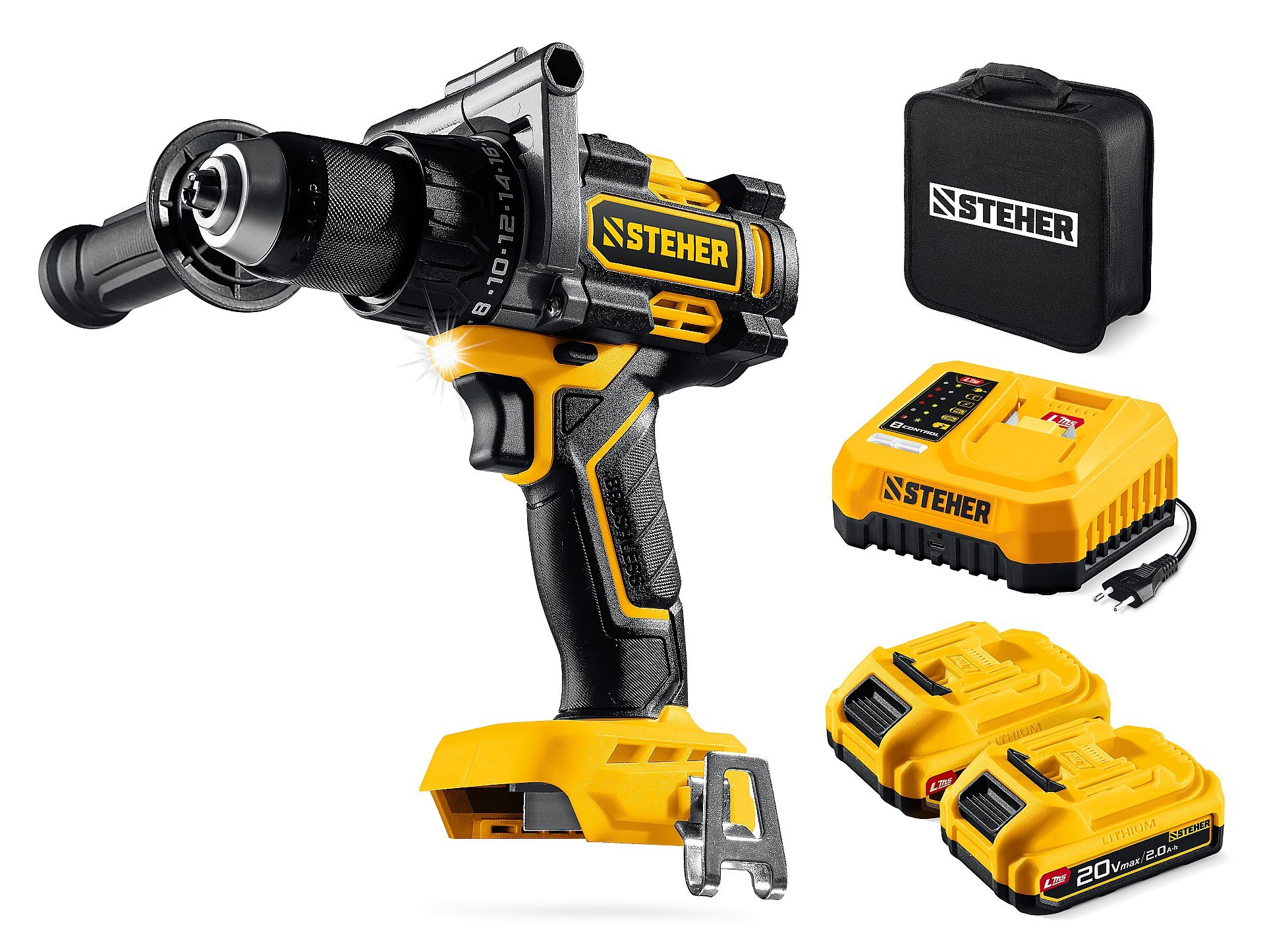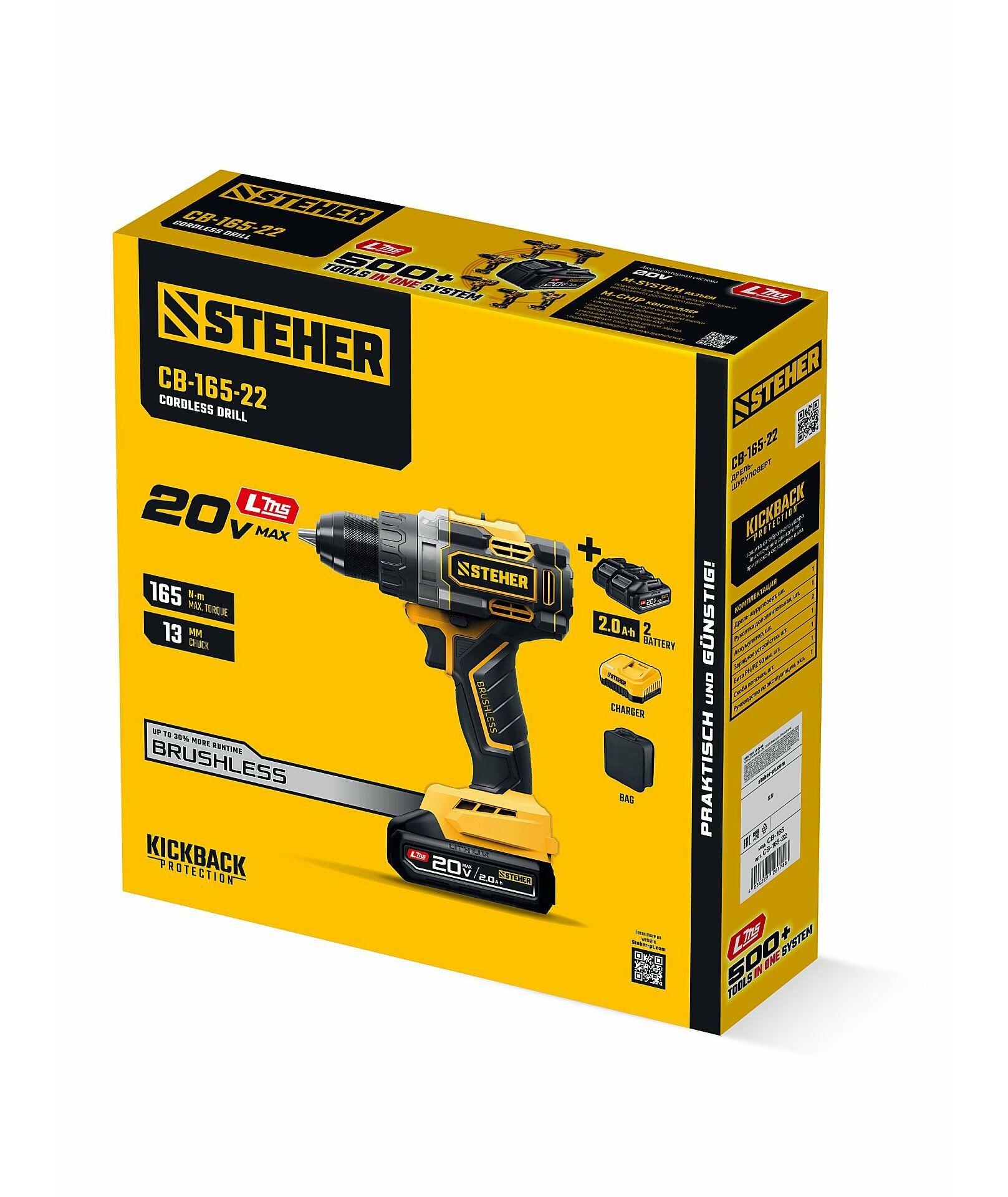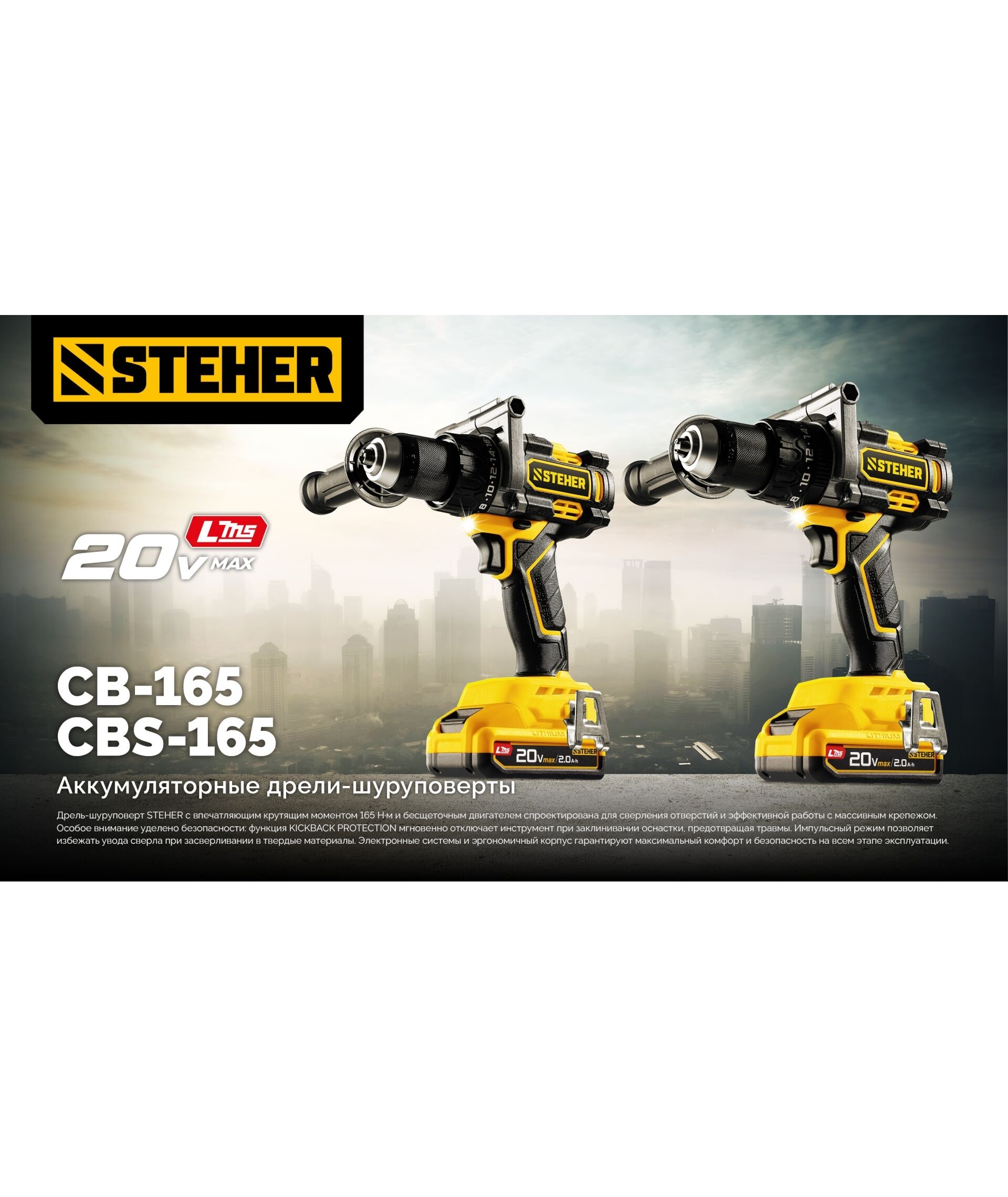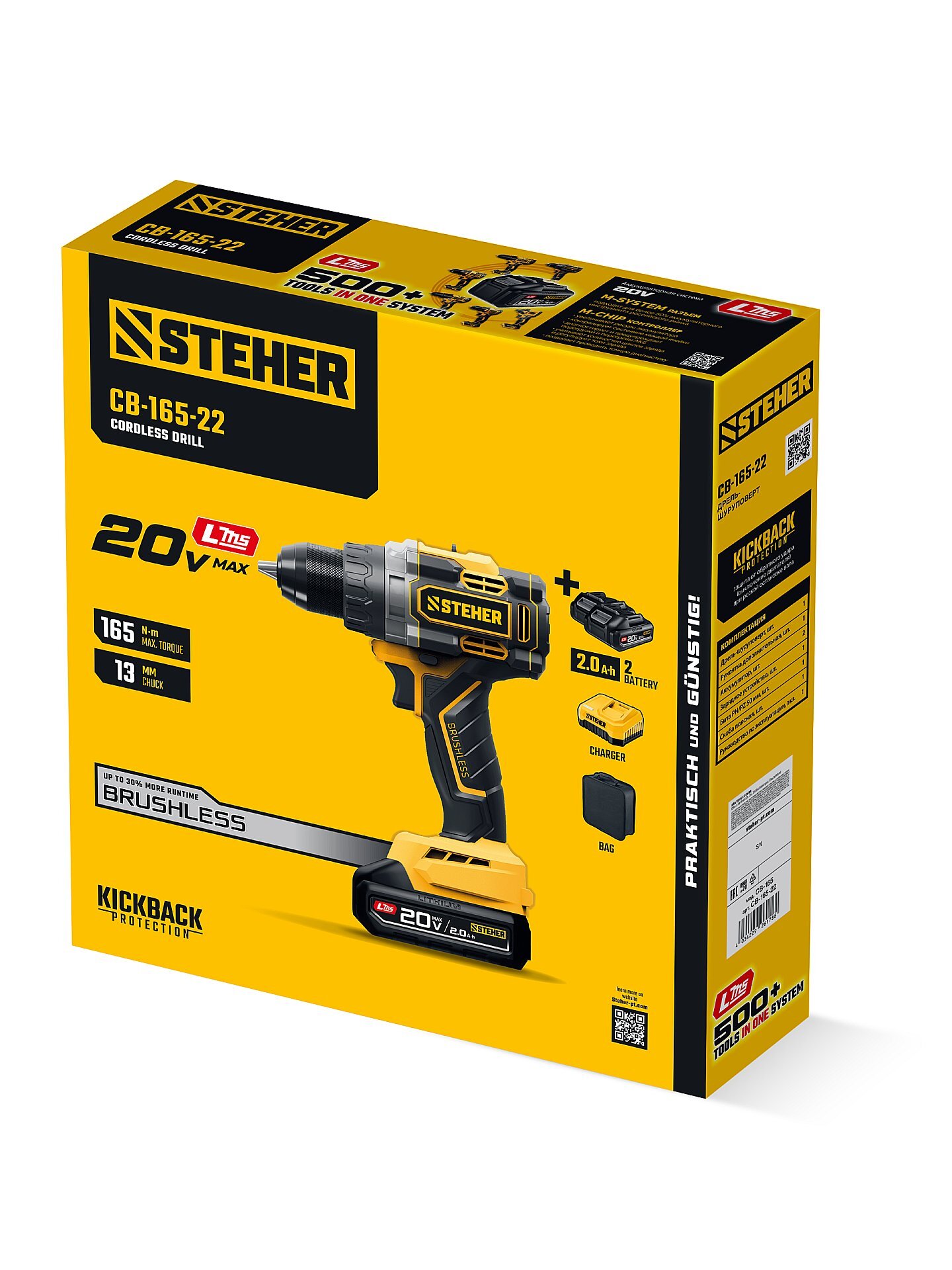 Бесщеточная дрель-шуруповерт STEHER CB-165-22 20 В, 165 Н·м, 2 АКБ LMS (2 А·ч), сумка