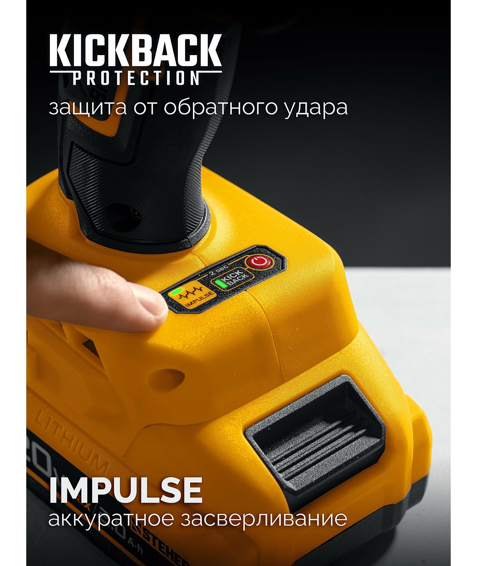 - Встроенная отключаемая защита от обратного удара контролирует рывки инструмента и выключает двигатель, предотвращая травмы оператора
