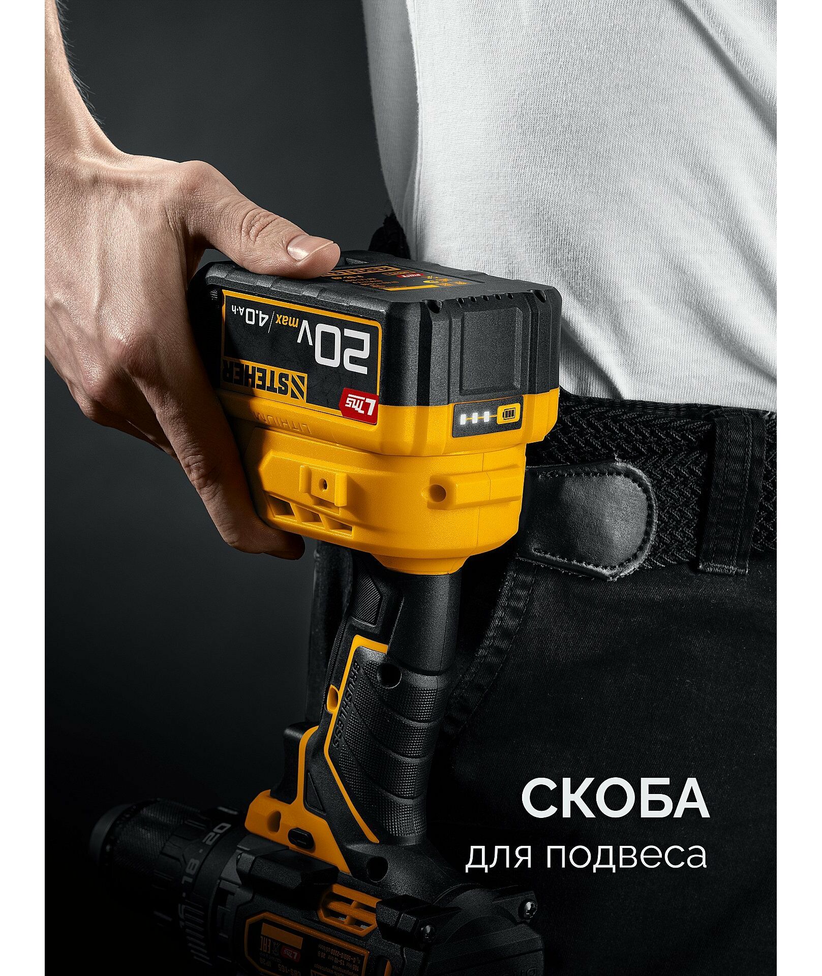 - Скоба для крепления на поясе, устанавливаемая с любой стороны инструмента