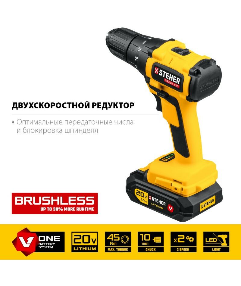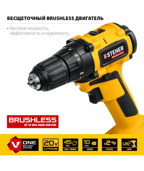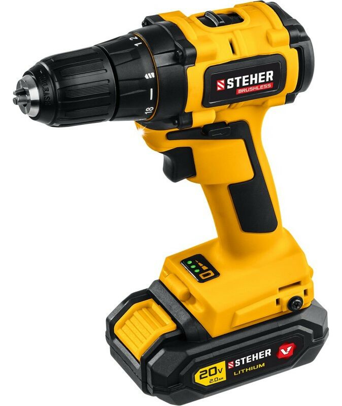 Дрель-шуруповерт STEHER CDB-200-1 20В, бесщёточная, 1 АКБ (2Ач), в кейсе