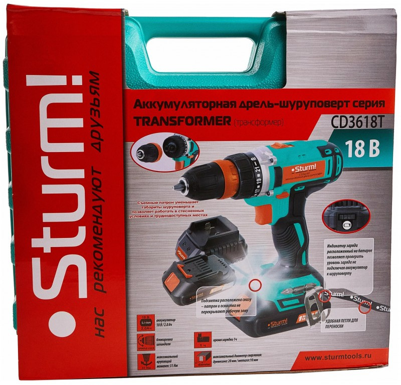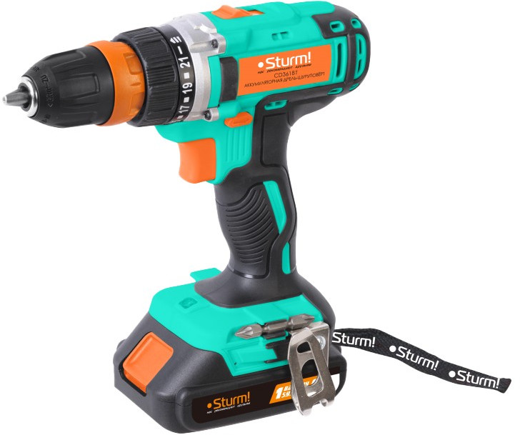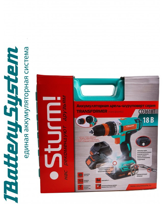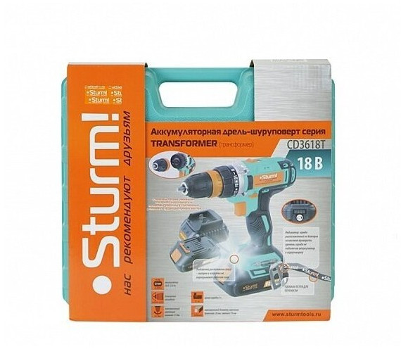 - Sturm CD3618T — аккумуляторный 18 В двухскоростной шуруповерт бытового назначения. Является частью линейки 1Battery System, обеспечивающей совместимость одного и того же аккумулятора с целым рядом инструмента. Важная особенность модели Sturm CD3618T — наличие сменного быстросъемного патрона, благодаря чему достигается максимально быстрая замена оснастки различного назначения. Особенно полезна данная опция при проведении работ с последовательным сверлением и закручиванием крепежных элементов.