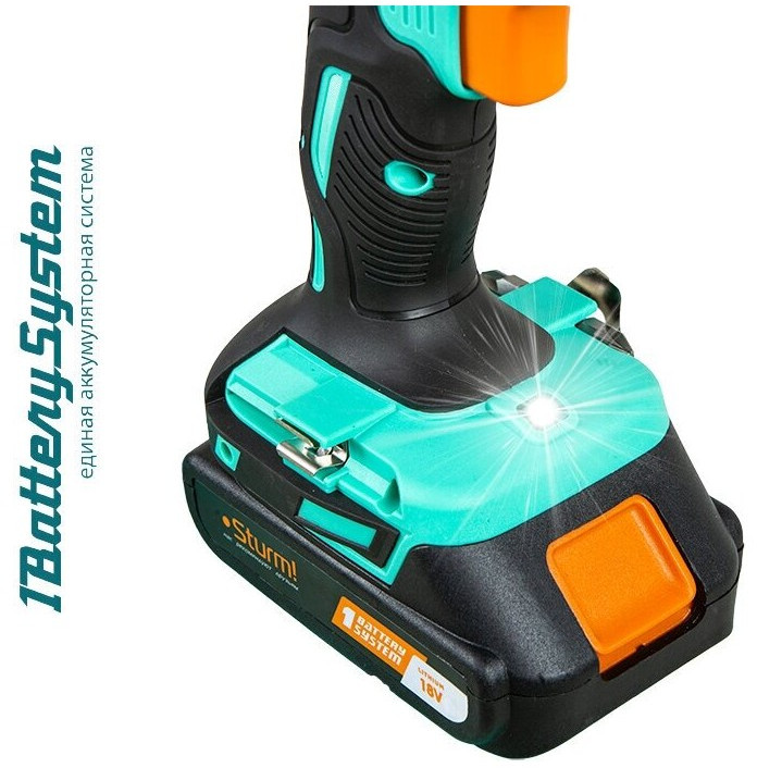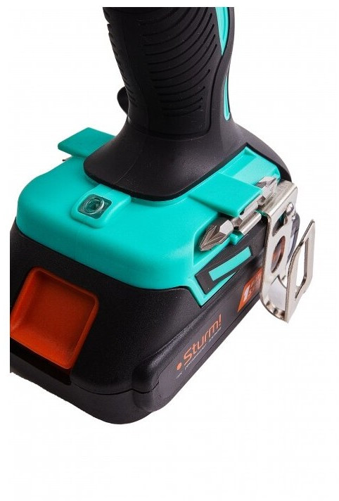 - Кроме того, широкий функционал Sturm CD3618T включает функцию блокировки вала шпинделя, благодаря которой оснастку можно заменять даже одной рукой, а также электронный тормоз выбега двигателя, обеспечивающий мгновенную остановку патрона. Для комфорта пользователя при работе в условиях недостаточной освещенности инструмент оснащен LED-подсветкой рабочей зоны — она имеет нижние размещение, что предполагает более эффективный охват рабочей зоны и исключение теней от патрона и оснастки.