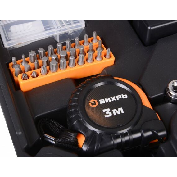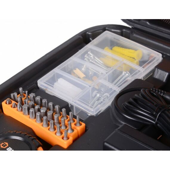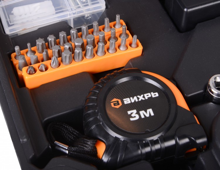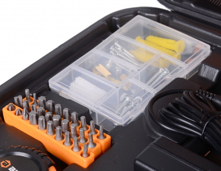 | Комплект поставки | кейс; аккумулятор и адаптер питания; рулетка 3 м.; набор бит - 30 шт.; набор крепежа в пластиковой коробке - 36 элементов; строительный нож с выдвижным лезвие; молоток-гвоздодер; отвертки для точных работ - 4 шт.; плоскогубцы; отвертка-адаптер для бит; шестигранные головки 8-12 мм. - 5 шт; ножницы. |