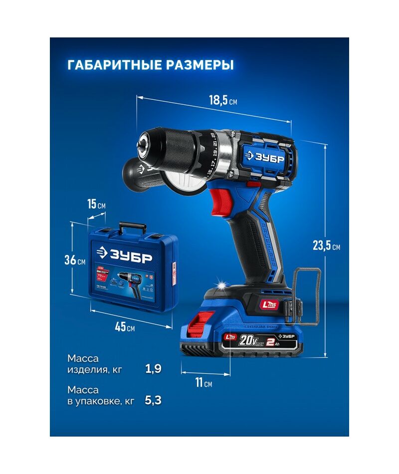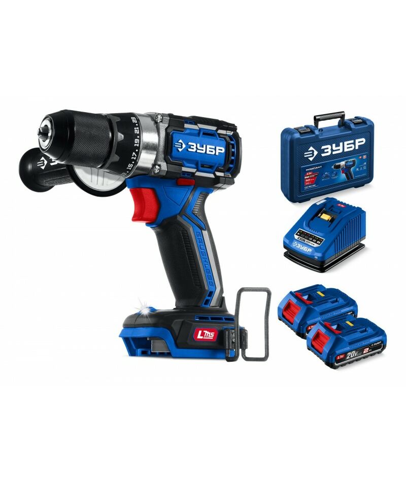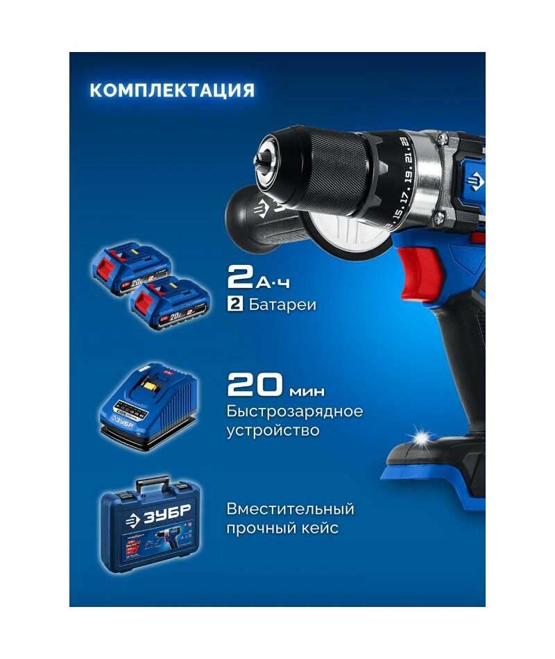 Бесщеточная дрель-шуруповерт Зубр DB-70-22 20 В, 70 Н·м, 2 АКБ LMS (2 А·ч), кейс, ПРОФЕССИОНАЛ