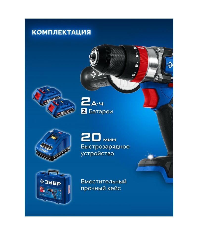 Бесщеточная ударная дрель-шуруповерт Зубр DBS-70-22 20 В, 70 Н·м, 2 АКБ LMS (2 А·ч), кейс, ПРОФЕССИОНАЛ