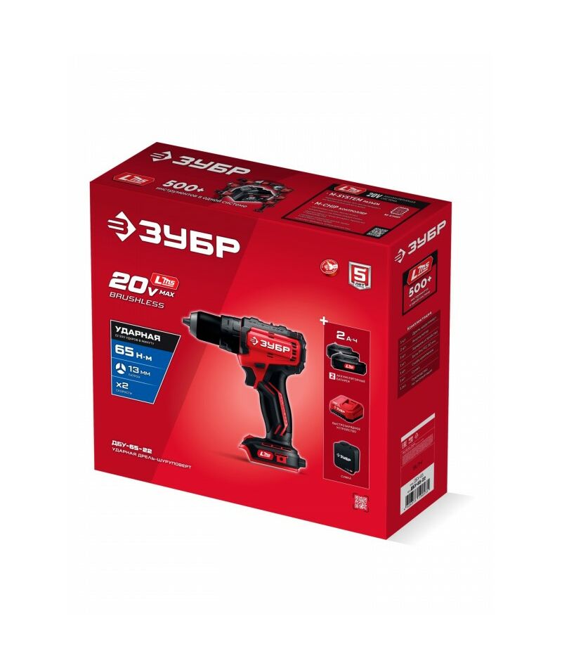 Бесщеточная ударная дрель-шуруповерт Зубр ДБУ-65-22 20 В, 65 Н·м, 2 АКБ LMS (2 А·ч), сумка
