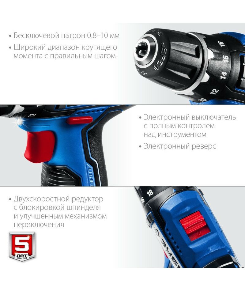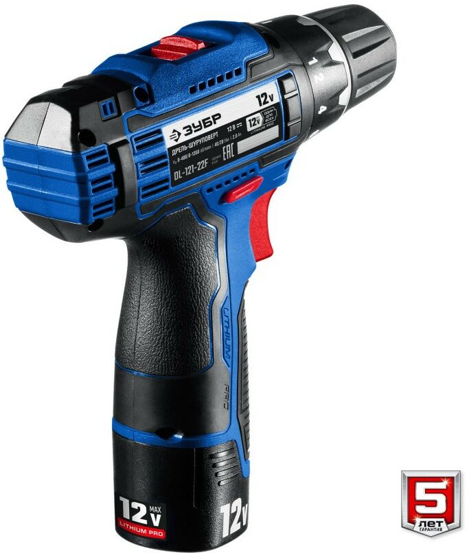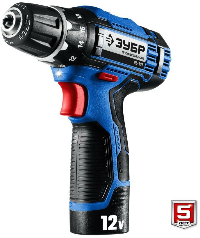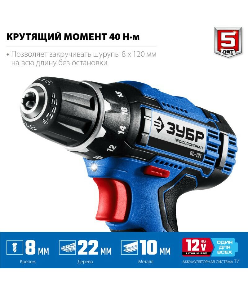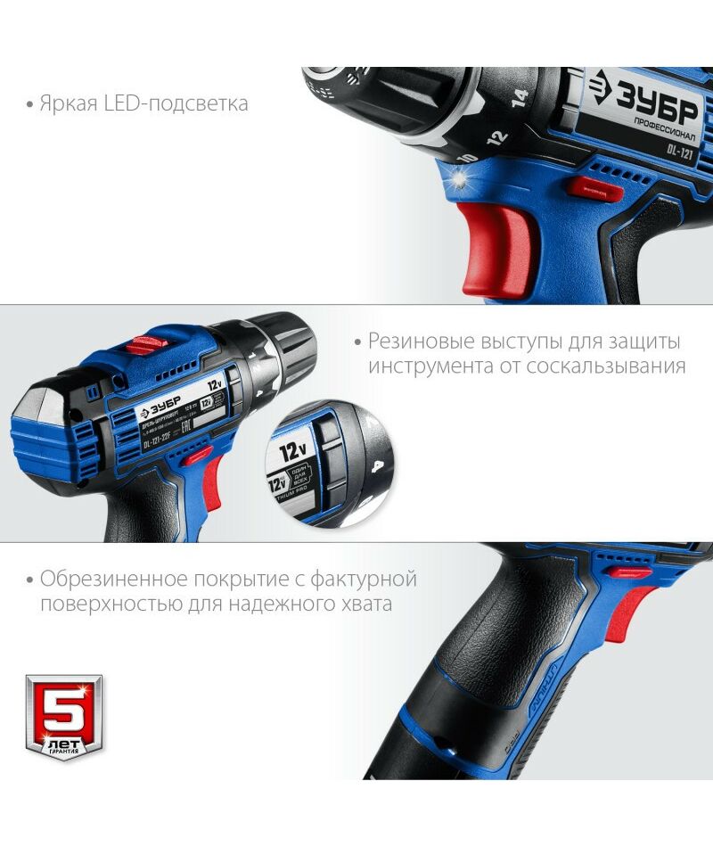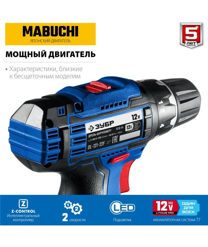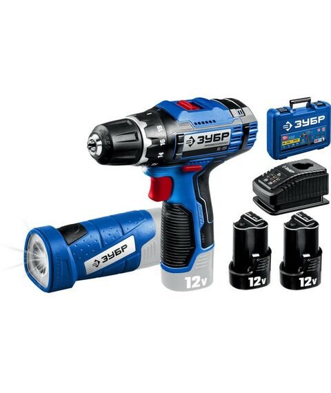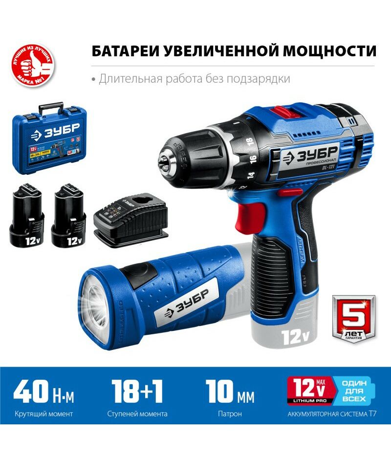 Дрель-шуруповерт Зубр DL-121-22F Профессионал 12В + LED фонарь, 2 АКБ (2Ач), в кейсе