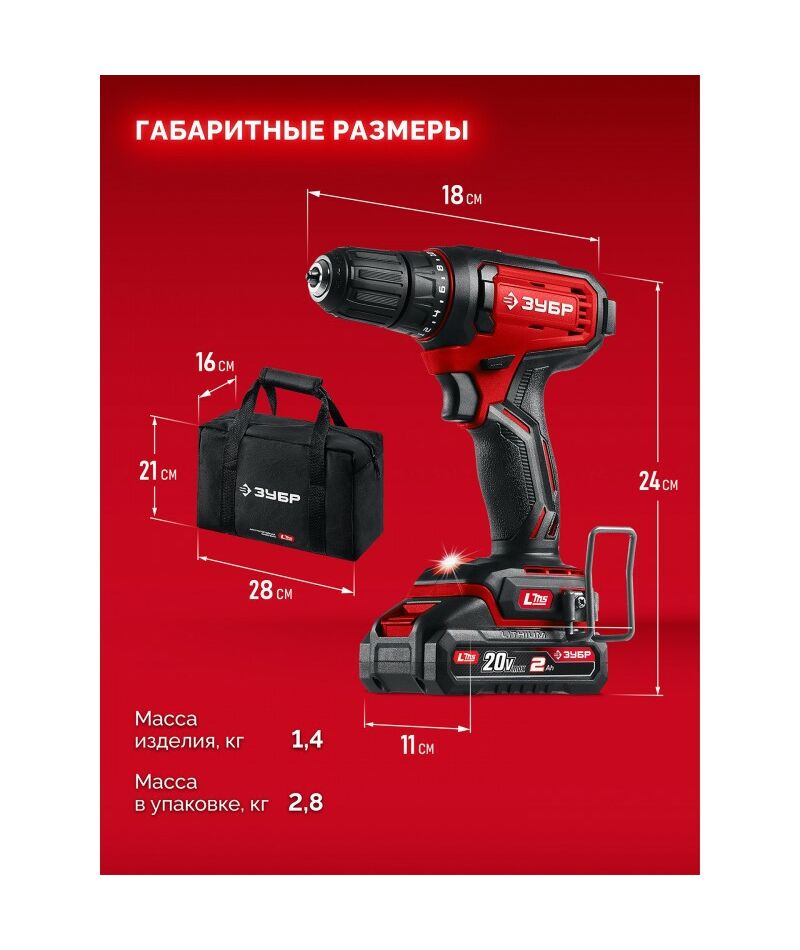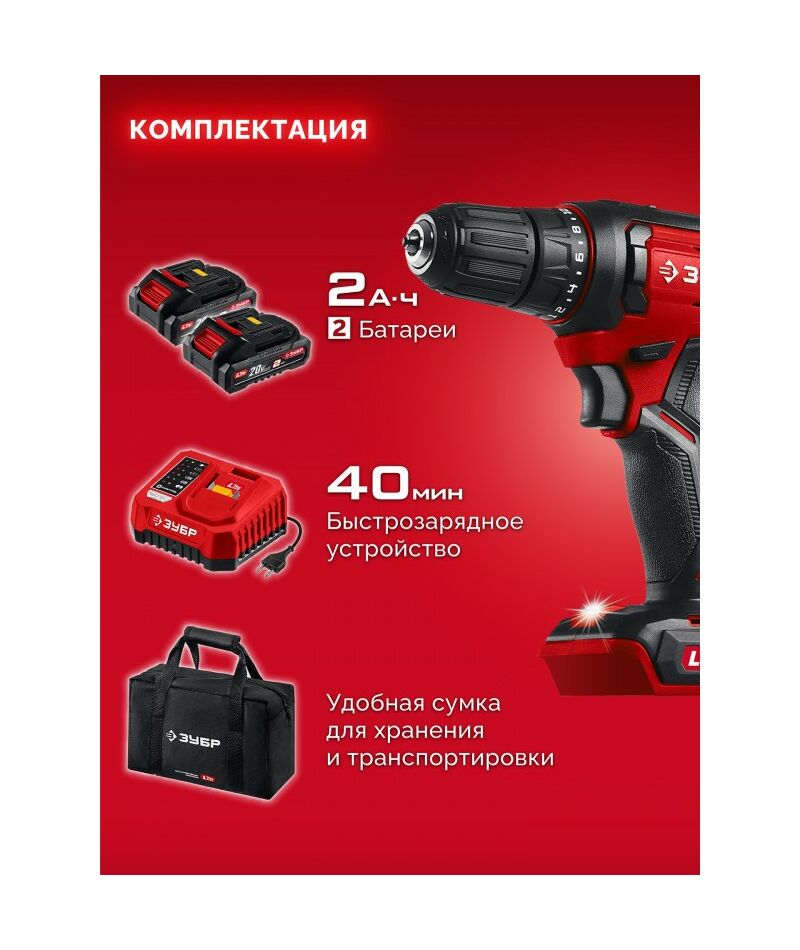 Дрель-шуруповерт Зубр ДШ-40-22 20 В, 40 Н·м, 2 АКБ LMS (2 А·ч), сумка