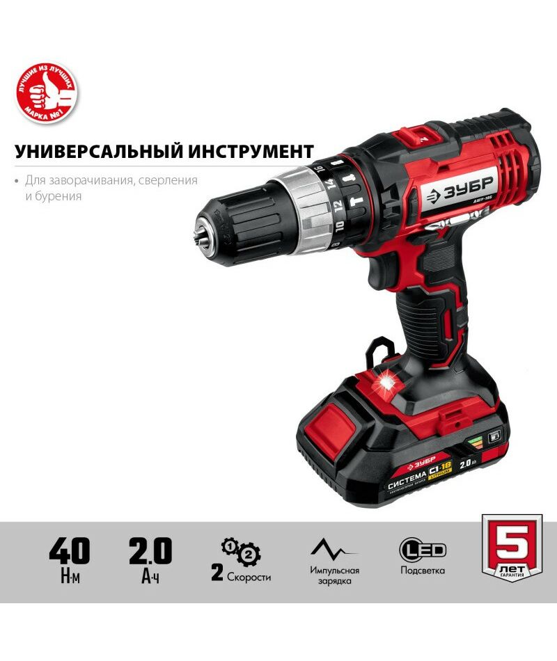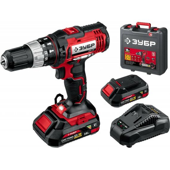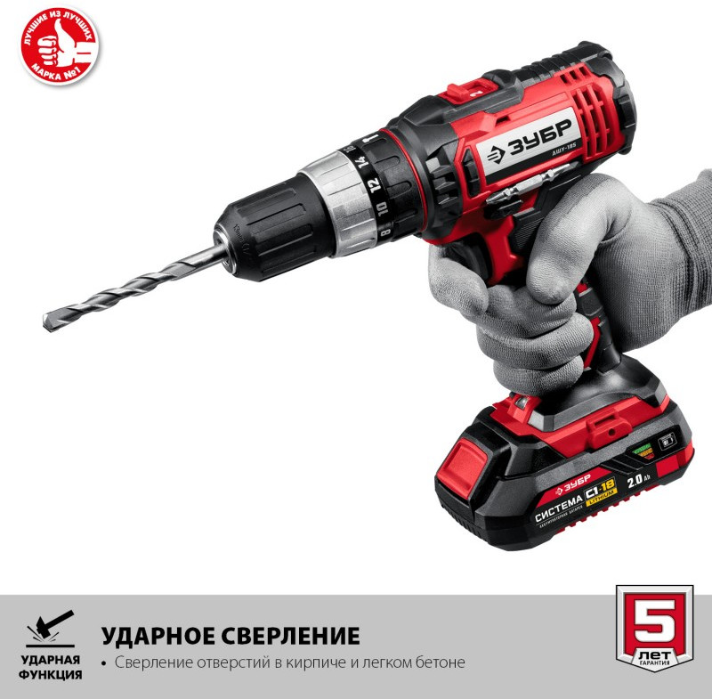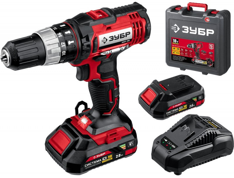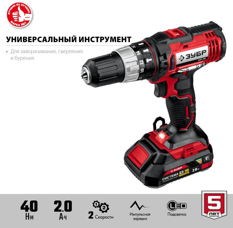 - Ударная дрель-шуруповерт ЗУБР - универсальный инструмент для сверления бетона, кирпича, камня и заворачивания метизов. Значительный крутящий момент на первой скорости позволяет выполнять работу со сверлами и крепежом больших диаметров, а высокие обороты на второй скорости - сверлить или выполнять работу быстрее. Два аккумулятора в комплекте помогают работать практически без перерывов