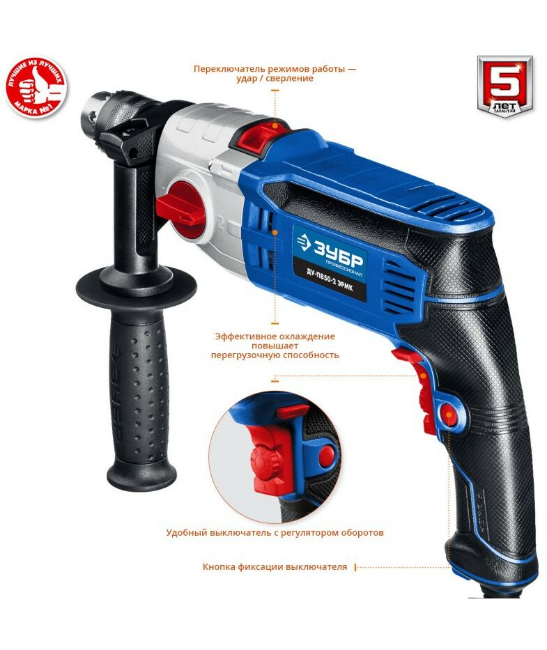 - Надежное удержание дрели благодаря обрезиненной основной и удобной дополнительной рукояткам