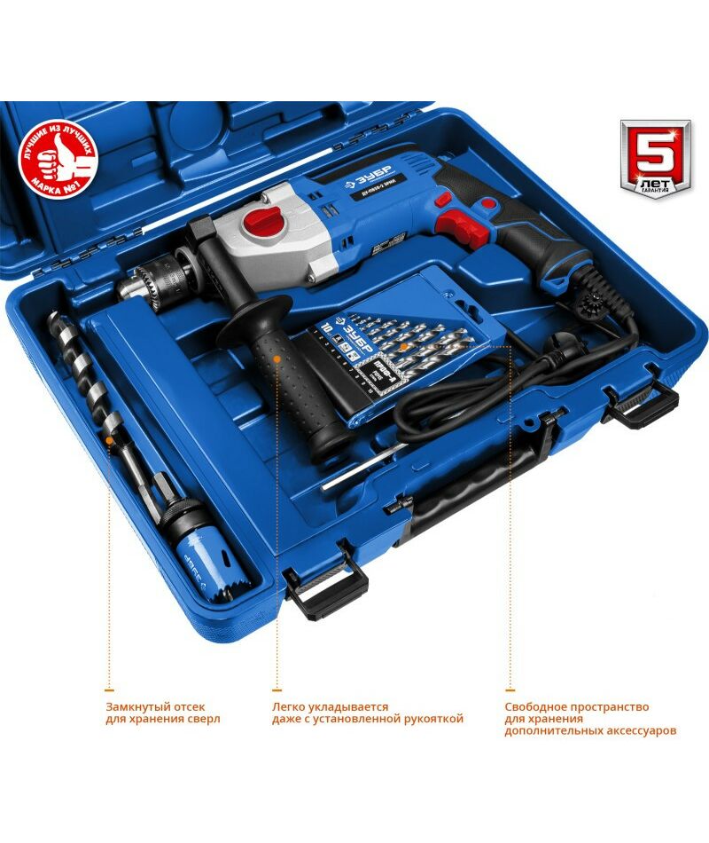 - Универсальный инструмент для сверления отверстий в различных материалах (дерево, сталь и т. д.). Профессиональная дрель с мощным двигателем, надежным ударным механизмом, продуманной эргономикой и вместительным кейсом