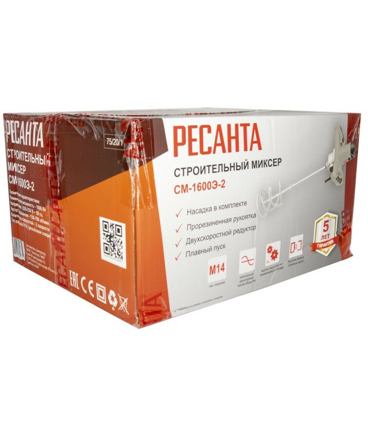Строительный миксер Ресанта СМ-1600Э-2 - электрический инструмент, предназначенный для перемешивания различных компонентов (сухой смеси, жидкости) при получении различных строительных и отделочных материалов (бетон, штукатурка, различные клеевые смеси, краска и т.д.)