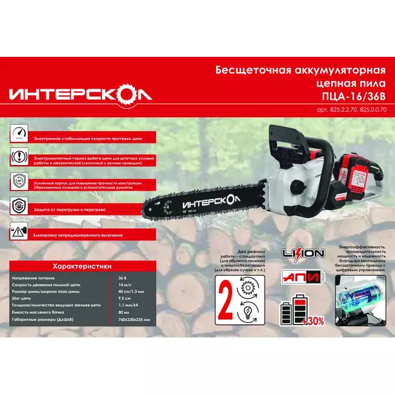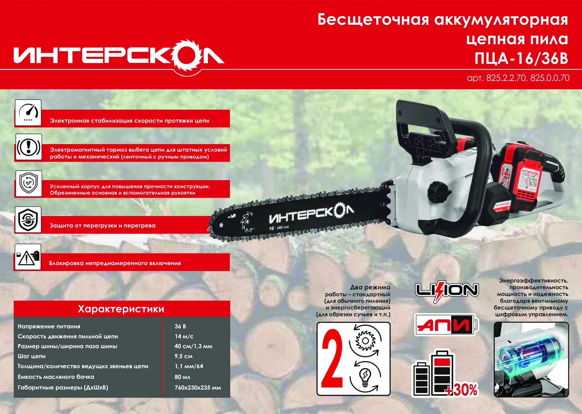 Цепная пила Интерскол ПЦА-16/36В аккум. дл.шины 16" (40cm) [825.0.0.70]