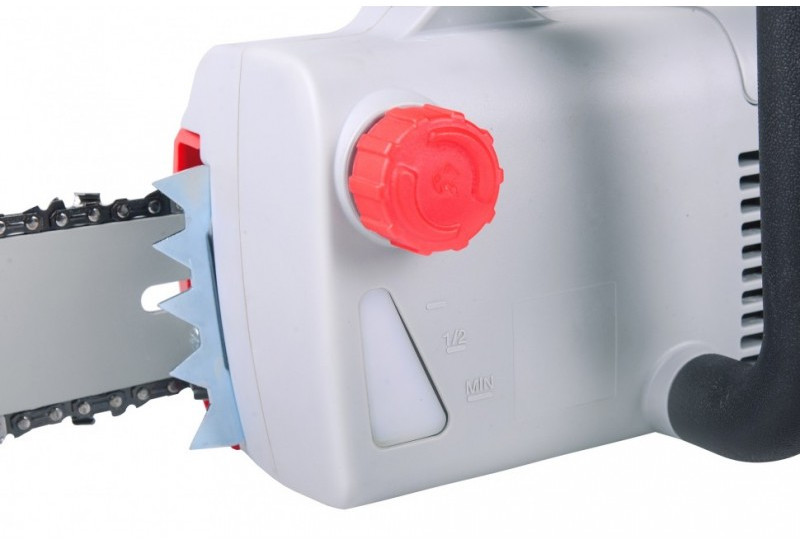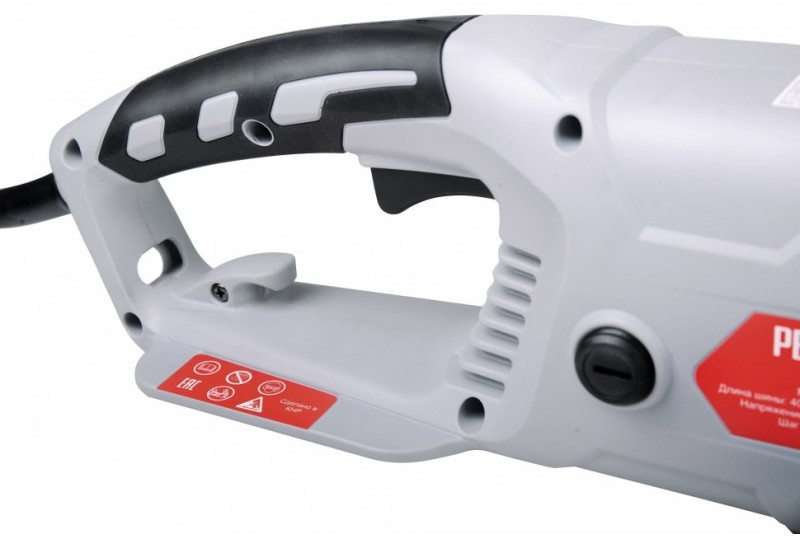 Преимущества: - Надежное удержание. Удобная задняя рукоятка небольшого размера с пусковым курком жестко сидит в руке, что способствует надежному удержанию электропилы.