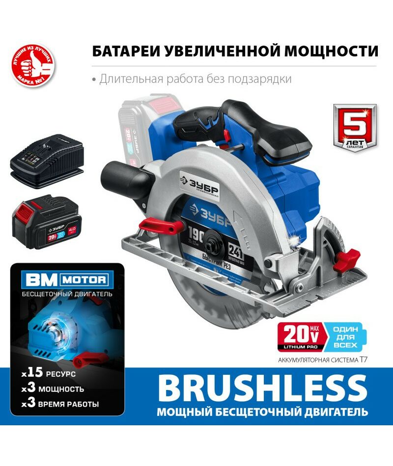 Бесщеточная пила циркулярная Зубр Профессионал CPB-190-41 20В, 1 АКБ (4Ач)