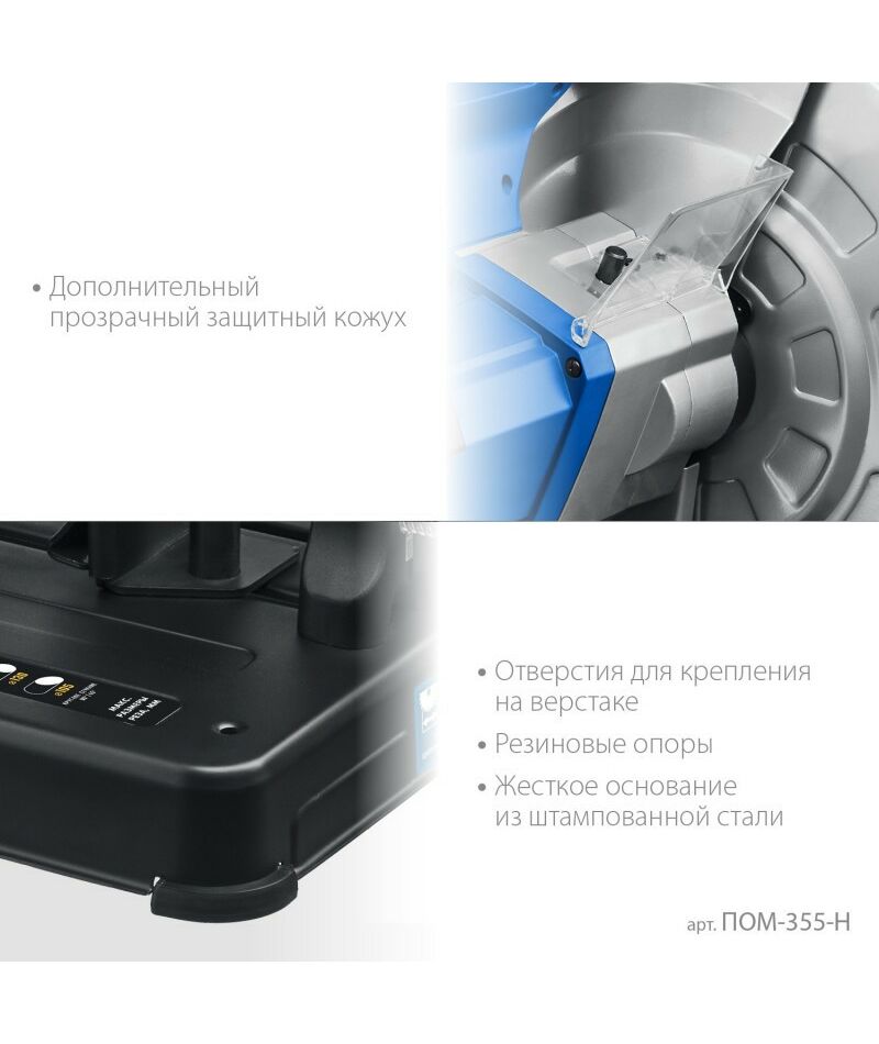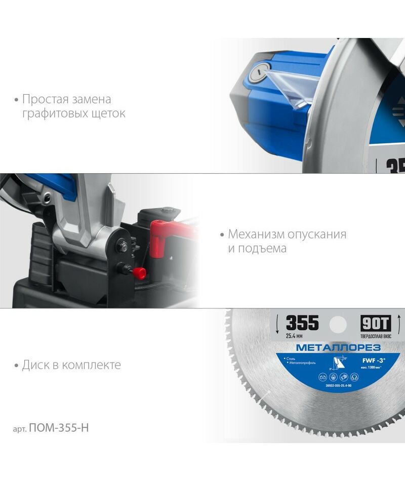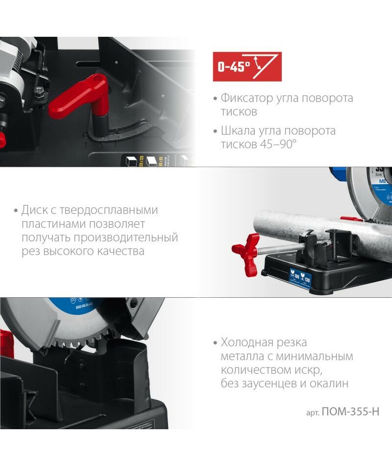 ПОМ-355-Н Профессиональная отрезная пила для пильных дисков по металлу. Диск с твердосплавными пластинами (в комплекте) позволяет получить стабильный производительный рез высокого качества, с минимальным количеством искр, без заусенцев и окалин.