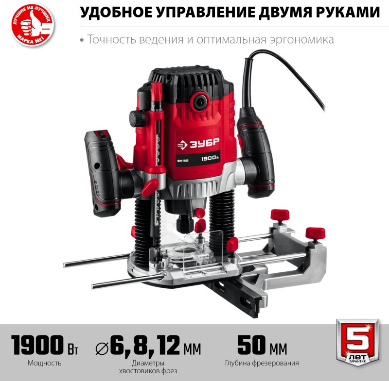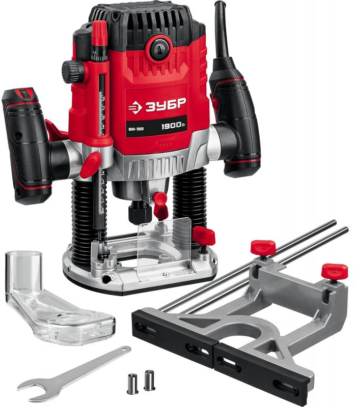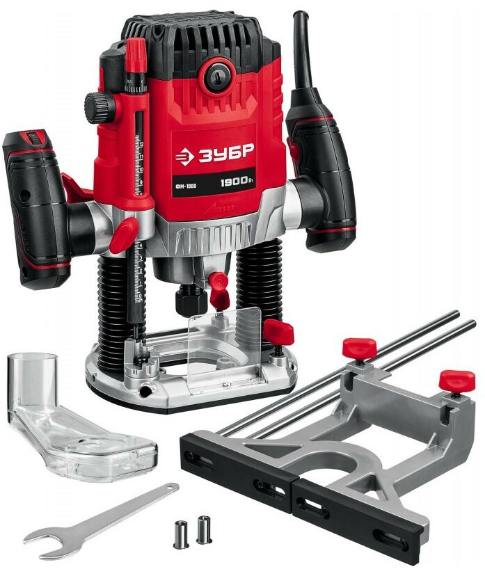 Фрезер ЗУБР – многофункциональное изделие для различных видов фрезерования (в т.ч. фигурного, по шаблону, по радиусу). Большая мощность позволяет работать с фрезами большого диаметра и с максимальной глубиной погружения. Точная настройка глубины фрезерования, три вида цанг для установки различных фрез, точный выбор оборотов, комплект принадлежностей для различных работБольшая мощность обеспечивает легкое фрезерование фрезами любого диаметра на любую глубинуПлавный пуск позволяет разгонять высокооборотистый двигатель без стартового рывкаЭлектронная регулировка частоты вращения для выбора оптимальных условий под любую работуПоддержание постоянных оборотов под нагрузкой позволяет работать без потери эффективностиРабочий ход фрезы 50 мм и возможность использования полного хода для фрез диаметром до 42 ммТри размера цанг позволяют использовать широкий спектр расходного инструментаПредварительная установка глубины при помощи шкалы и ступенчатое изменение благодаря револьверному упоруОдновременная установка прозрачного щитка и патрубка для пылесосаПараллельный упор с точной настройкой для ровного пиления вдоль кромкиБыстрая замена щеток облегчает и ускоряет обслуживаниеИспользование. Для фрезерования (в т.ч. фигурного, по шаблону, по радиусу) заготовок из дерева, древесно-стружечных плит, пластмасс и металла (при установке соответствующих фрез)