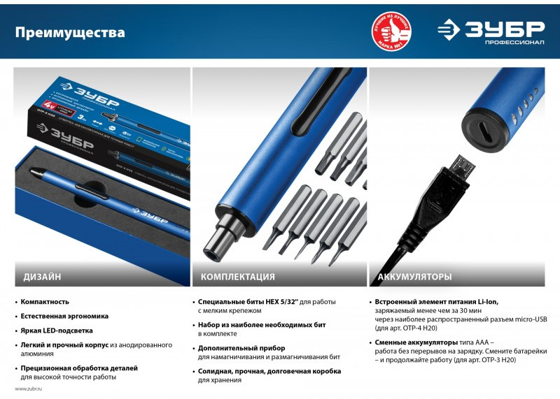 Отвертка аккумуляторная Зубр Профессионал ОТР-4 Н20 4 Vmax для точных работ с набором 20 бит
