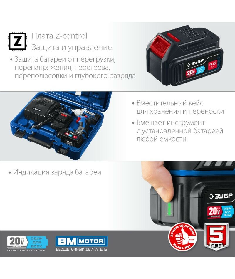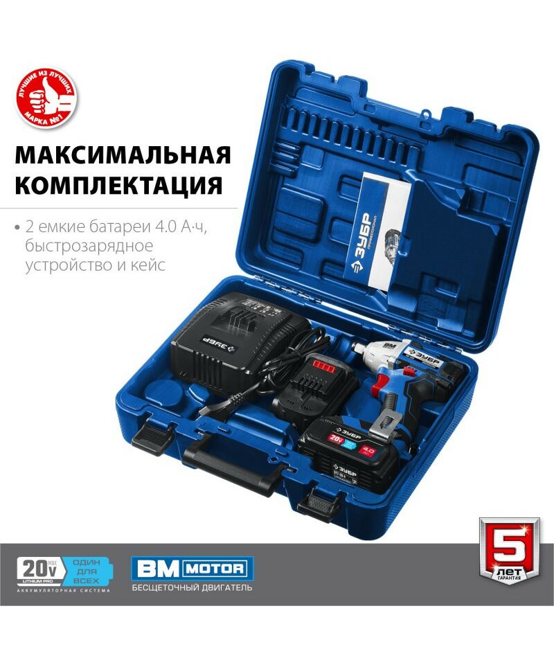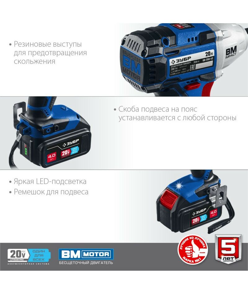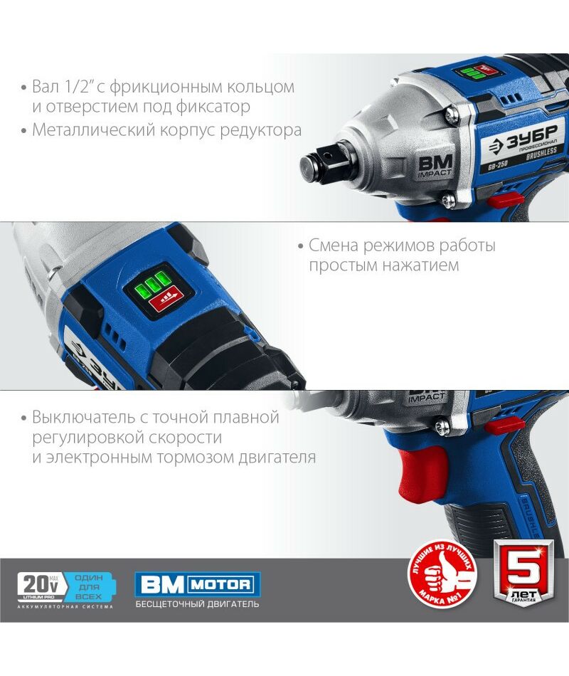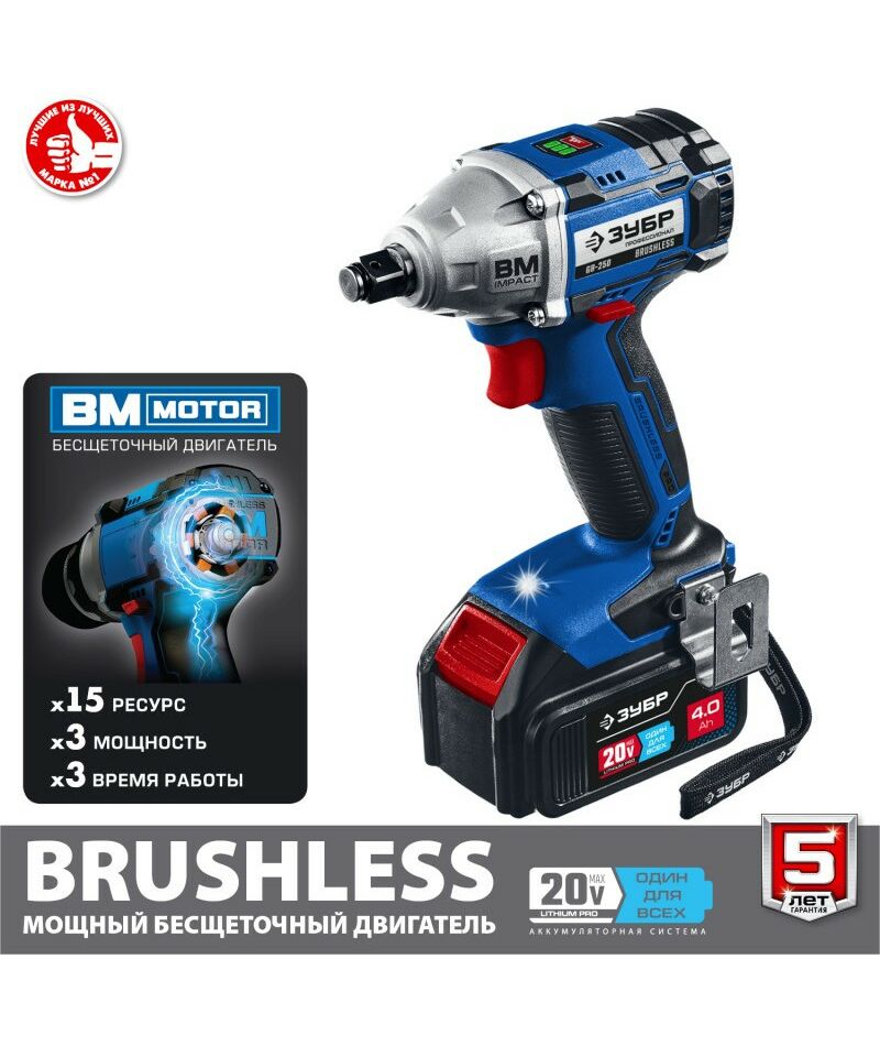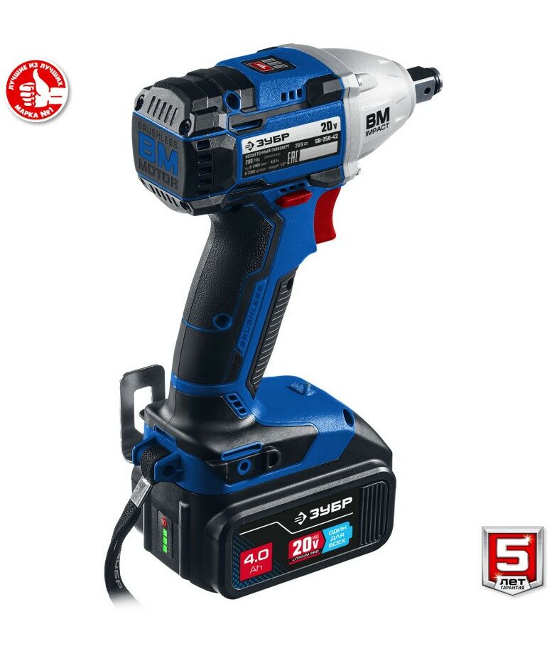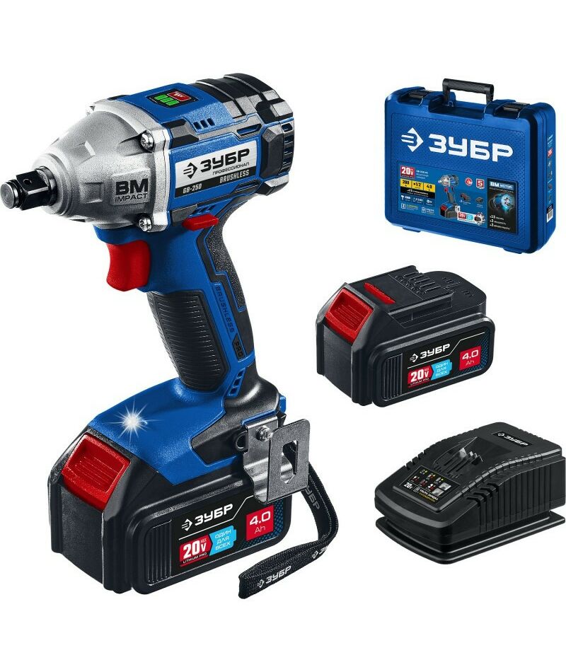 Гайковерт бесщеточный Зубр Профессионал GB-250-42 20В, 2 АКБ (4Ач), в кейсе