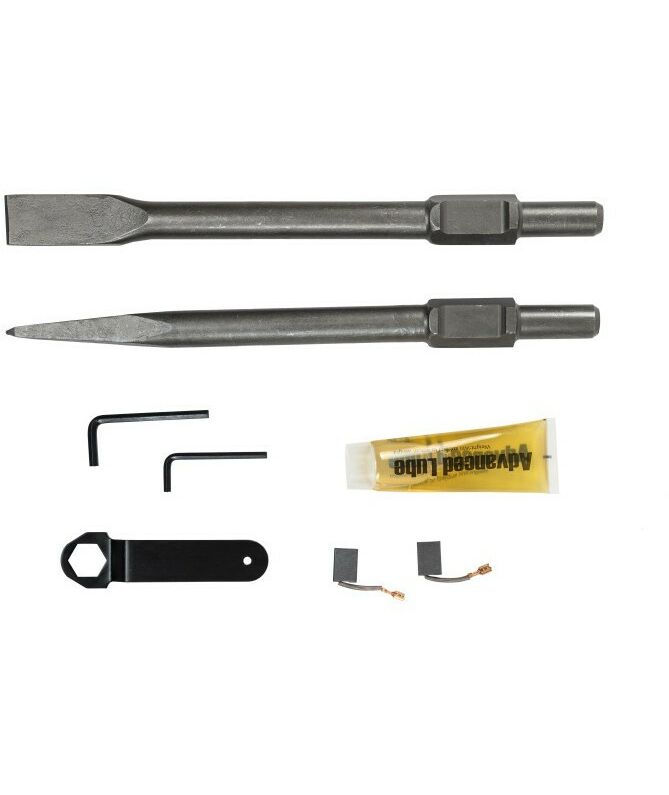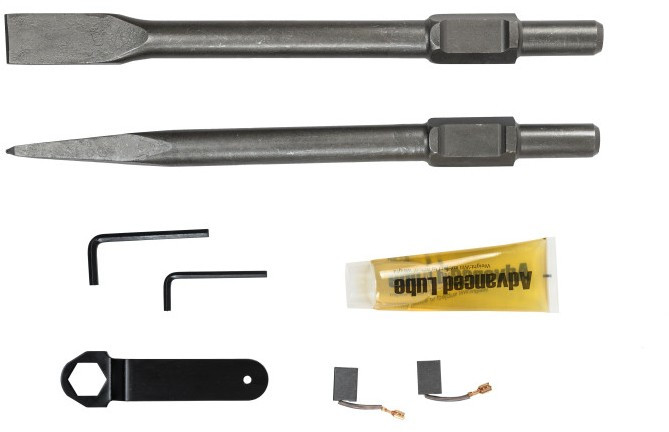 - В комплекте с устройством поставляется пика и зубило вместе с тюбиком для смазки. Молоток полностью укомплектован и готов к использованию.