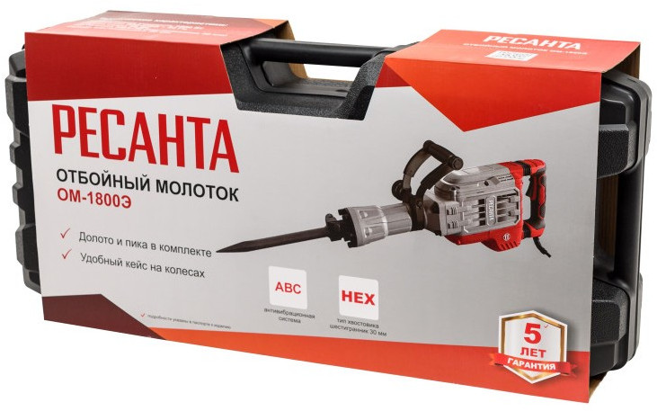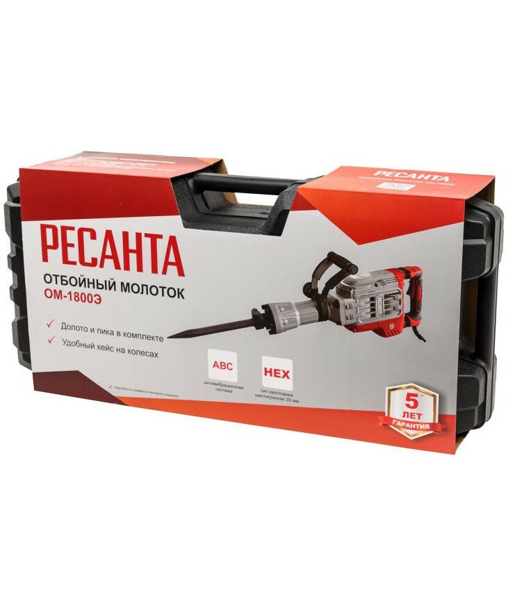 - Отбойный молоток Ресанта ОМ-1800Э надежное и качественно выполненное устройство. Он поможет быстро и эффективно провести демонтажные работы. С помощью молотка можно не только ломать стены, но и вскрывать асфальтное покрытие. Инструмент будет незаменим при строительных и ремонтных работах.