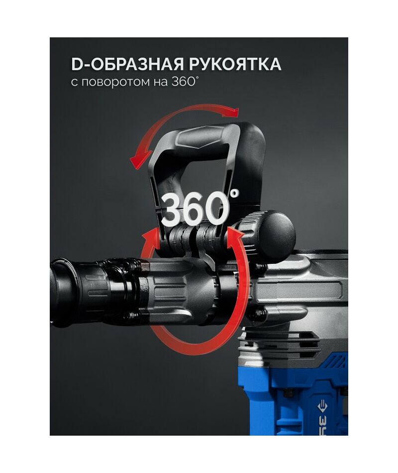 - Регулируемая на 360° и по углу наклона дополнительная D-образная рукоятка обеспечивает удобный и надежный хват в любом положении изделия