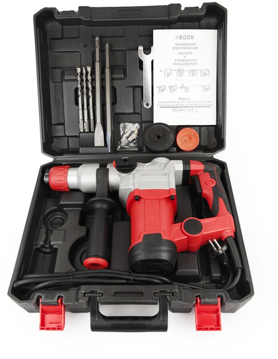 Перфоратор ручной электрический Edon RH-36/1550V среднего класса с вертикально расположенным двигателем и массивным редуктором и усиленным патроном SDS+. Эта модель прекрасно работает как в режиме сверления с ударом(бурения), так и может выдерживать повышенные нагрузки при длительной работе в режиме удара. Основная прорезиненная и дополнительная рукоятки позволяют четко контролировать инструмент в руках. Основная рукоятка оснащена эффективной системой виброгашения, это позволит значительно уменьшить негативное влияние отдачи на оператора