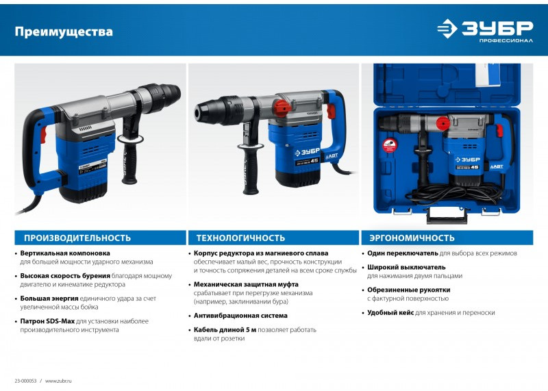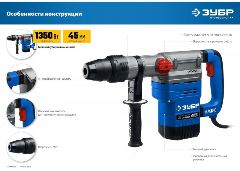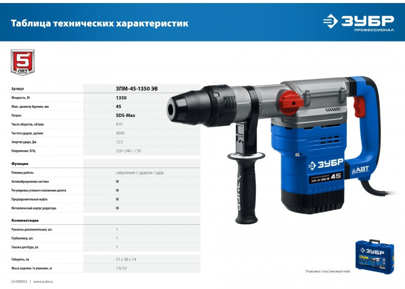 Перфоратор Зубр Профессионал ЗПМ-45-1350 ЭВ 1350 Вт, 45 мм, SDS Max, серия