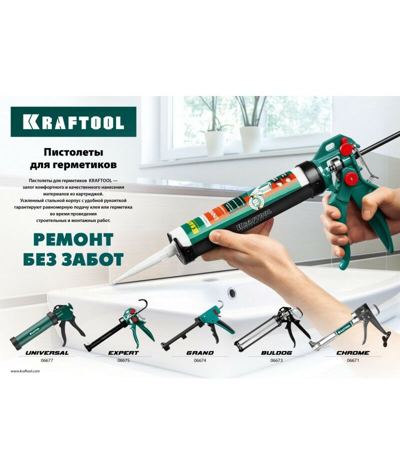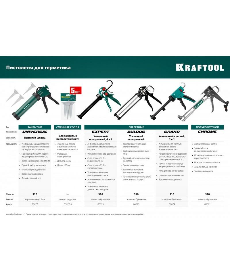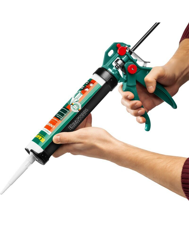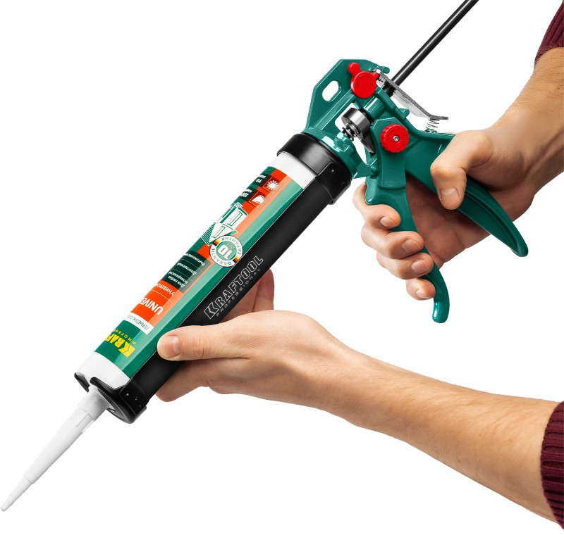 Пистолет для герметиков подходит для работы с картриджами объемом 310 мл, имеет усиленную скелетную конструкцию из стали, ручку из алюминиевого сплава, которые способствуют равномерной подачи клея либо герметика. Данная спецификация обеспечивает прочность и надежность конструкции пистолета при использовании.
