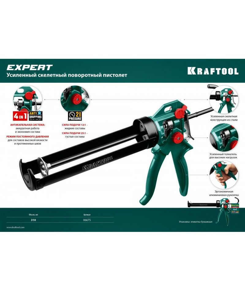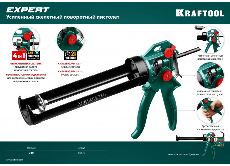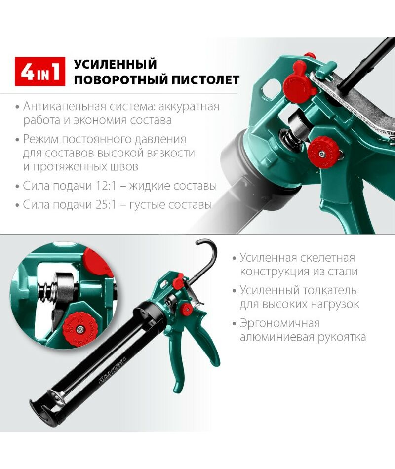 Пистолет для герметика усиленный KRAFTOOL EXPERT 4-in-1 скелетный, поворотный, 310 мл [06675]