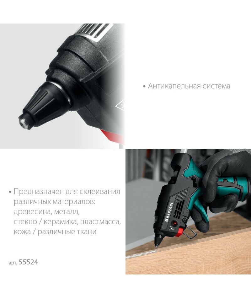Предназначен для склеивания различных материалов: древесины, металла, керамики, стекла, пластмассы, кожи, ткани при помощи разогретого клея.