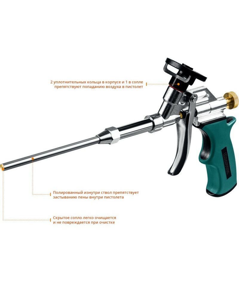 - Инновационная конструкция с двумя уплотнительными кольцами в корпусе и прецизионная обработка игольчатого клапана и сопла обеспечивают надёжную герметизацию, предотвращая попадание воздуха в пистолет, что минимизирует риск затвердевания пены внутри корпуса