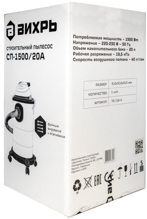 - Строительный пылесос Вихрь СП-1500/20А предназначен для сухой и влажной уборки помещений, а также для совместного использования с электроинструментом при принудительном удалении продуктов строгания, пиления