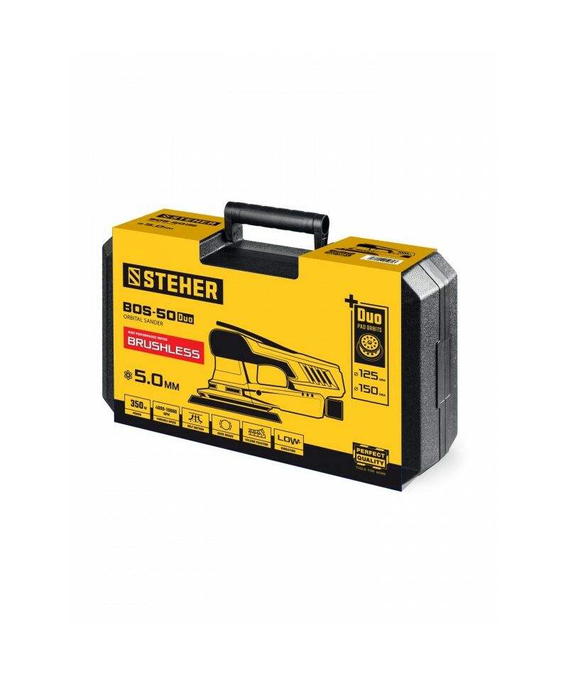 Орбитально-шлифовальная машина STEHER BOS-50 Duo d125 / d150 мм, 5.0 мм, 350 Вт, бесщеточная, кейс [BOS-50]