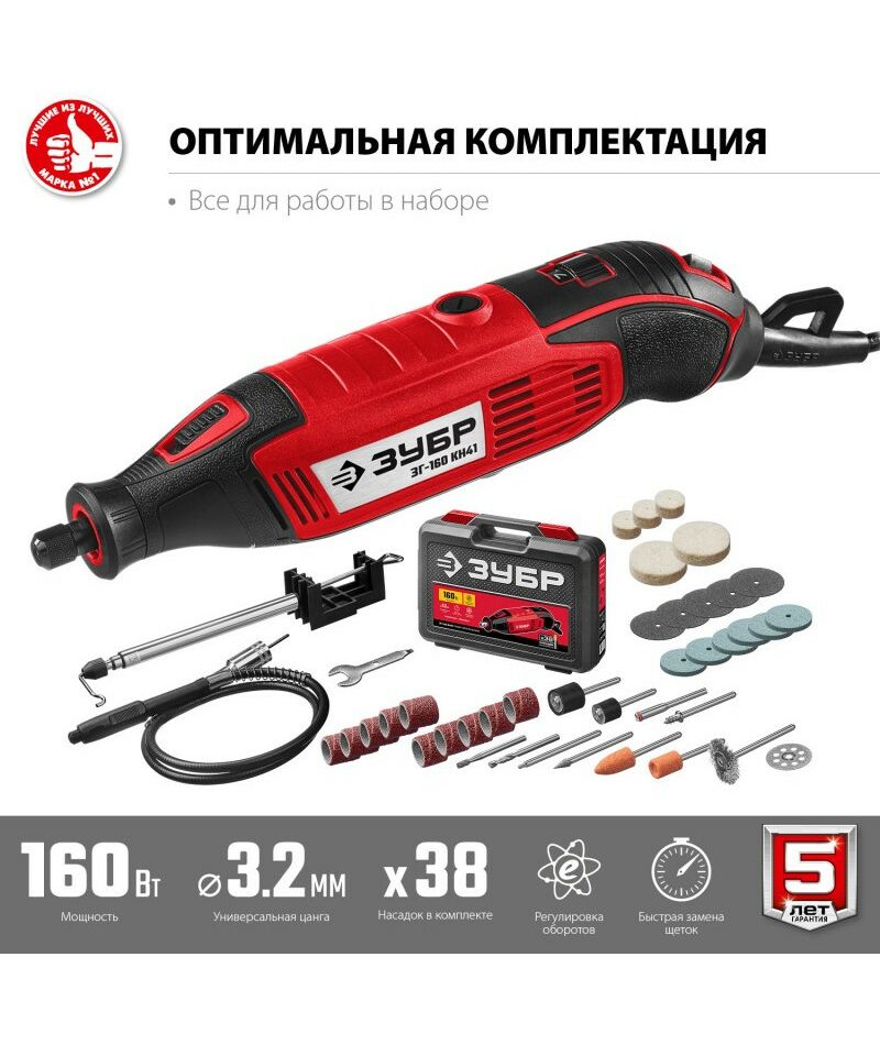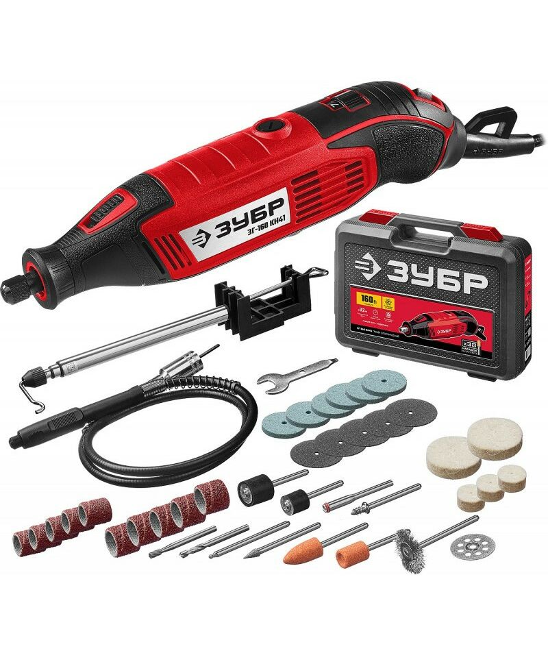 Гравер электрический Зубр ЗГ-160 КН41 220В, 160 Вт, 3.2 мм, 15000-35000 об/мин, набор насадок, цанг и державок, гибкий вал, штатив, 41 предмет, кейс