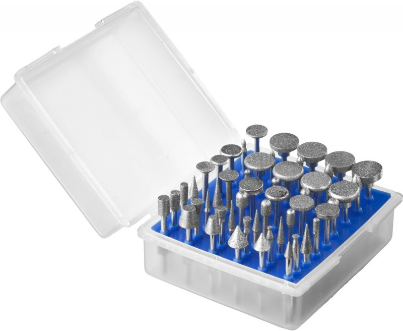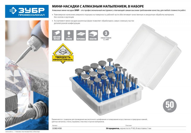 Набор мини-насадок с алмазным напылением Зубр Профессионал 33383-H50 в пластиковом боксе, Р 180, хвостовик 3мм, 50 предметов