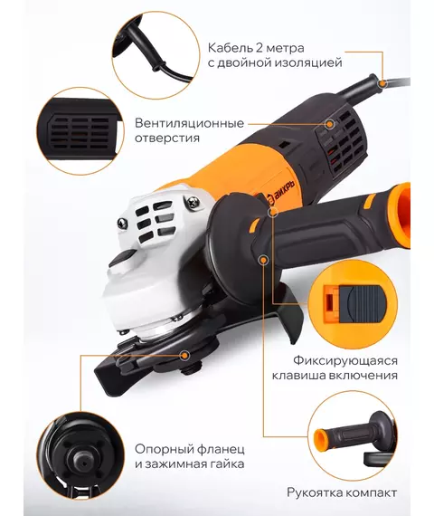 | Особенности | Электронная регулировка оборотов; константная электроника. система поддержания оборотов под нагрузкой; плавный пуск;бронирование ротора; быстрозажимной кожух. изменение положения кожуха без инструмента; рукоятка - компакт. |