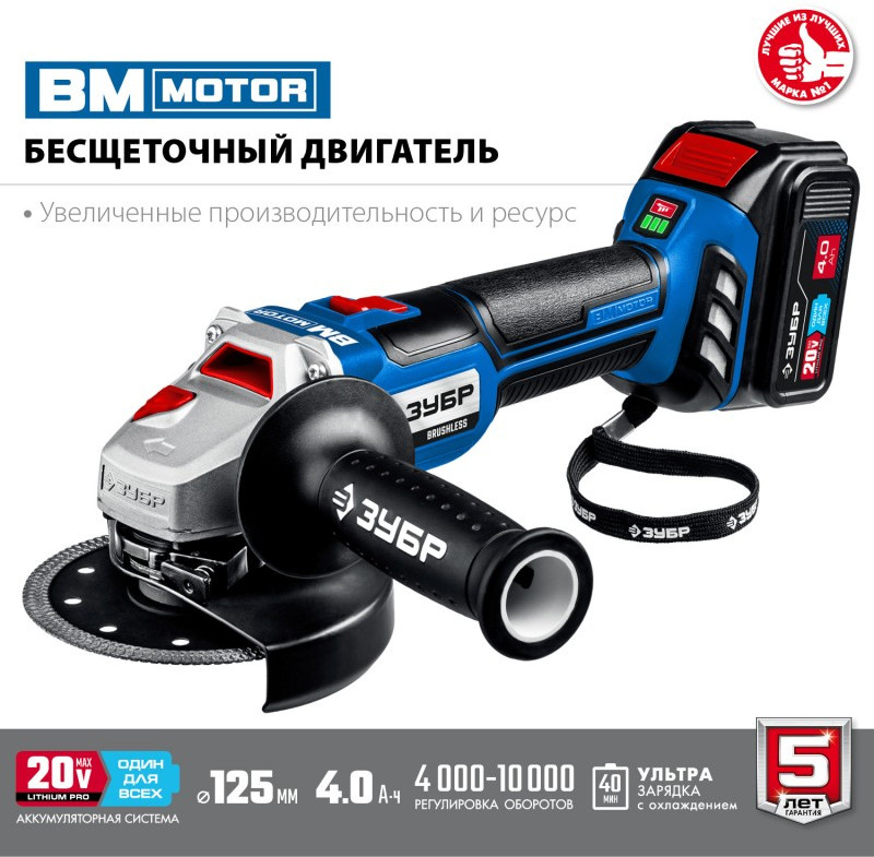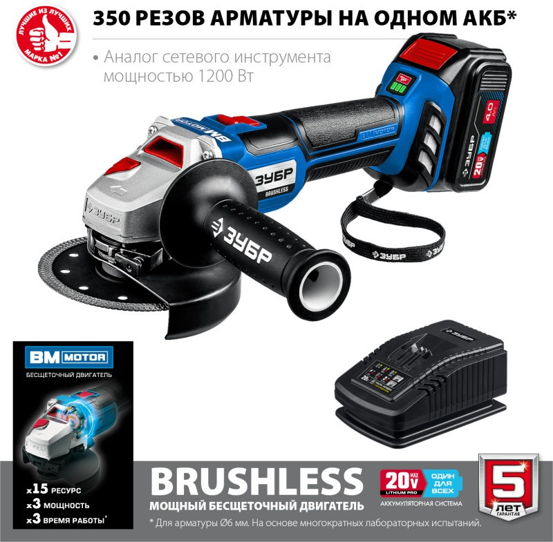 - Высокотехнологичная замена сетевой УШМ мощностью до 1200 Вт. Мощная батарея емкостью 4 Ач и быстрая зарядка током 6А уменьшают простои. При меньшем, чем у сетевого аналога, весе данная модель обладает максимальной мобильностью, гораздо более удобной эргономикой, имеет все вспомогательные и защитные системы. Что в совокупности с бесщеточным двигателем с длительным ресурсом делает данную модель гораздо более выгодным выбором к приобретению
